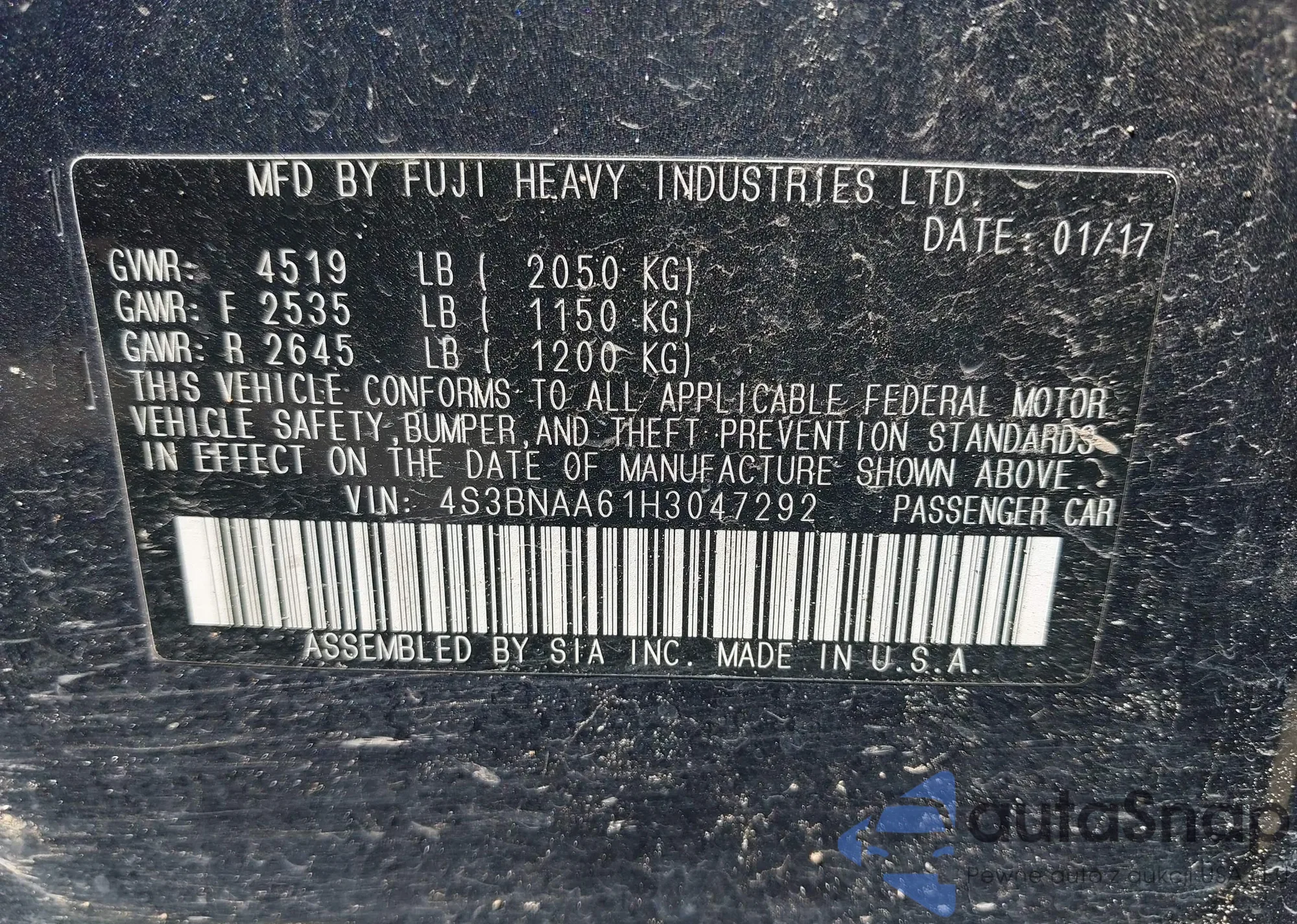 • VIN 4S3BNAA61H3047292