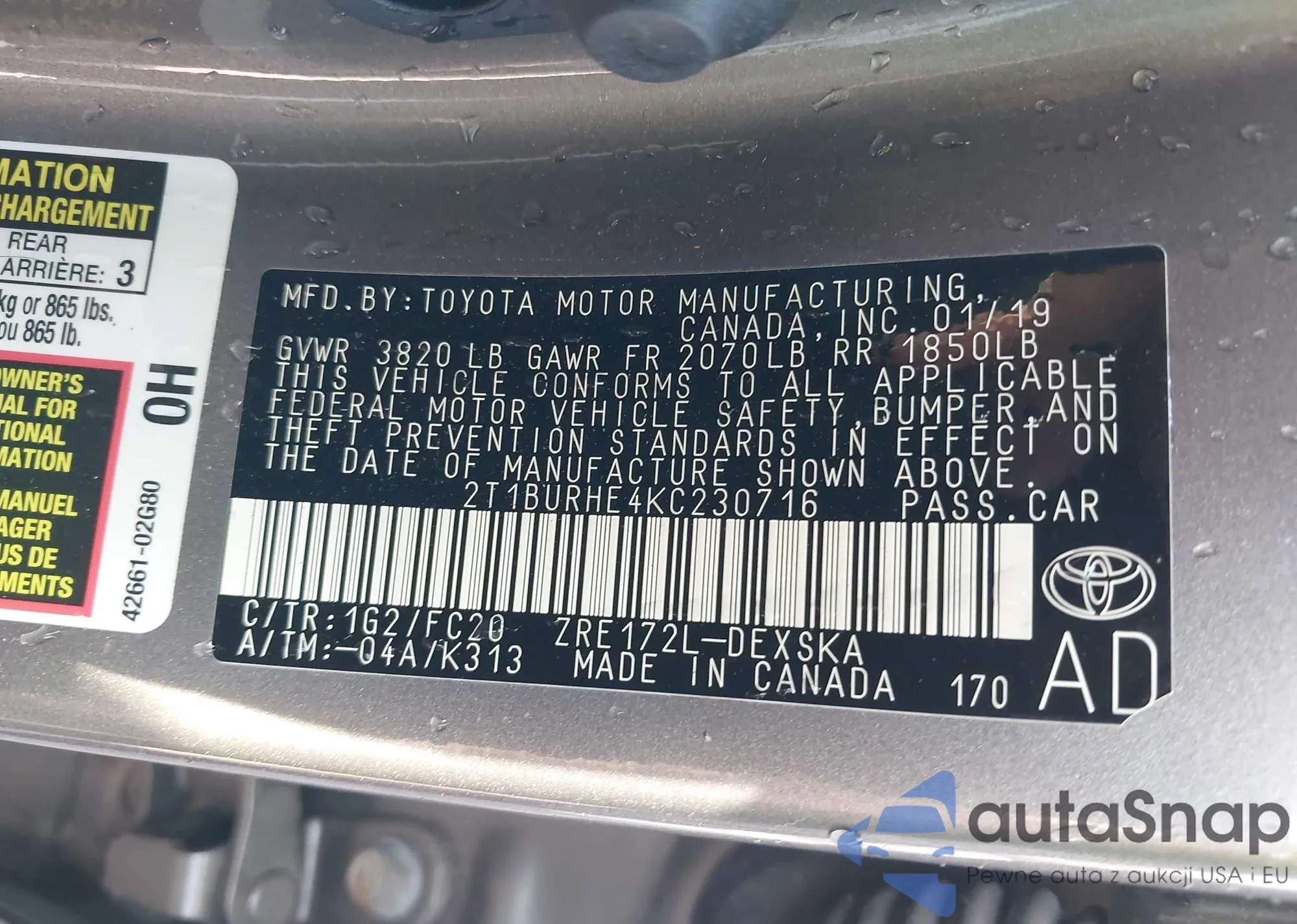 LOT: 43350725 VIN: 2T1BURHE4KC230716