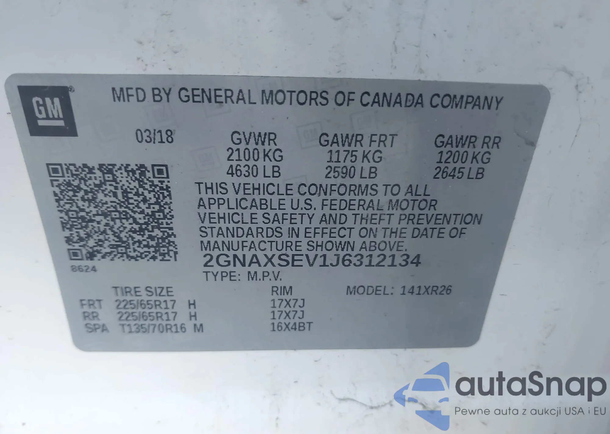 LOT: 43352660 VIN: 2GNAXSEV1J6312134