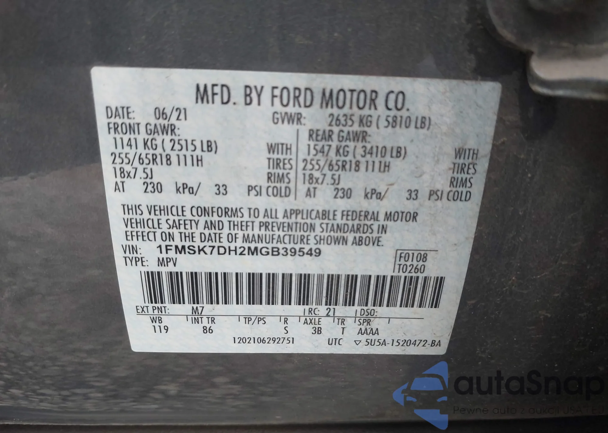LOT: 43118147 VIN: 1FTEW1CP9MFB93724