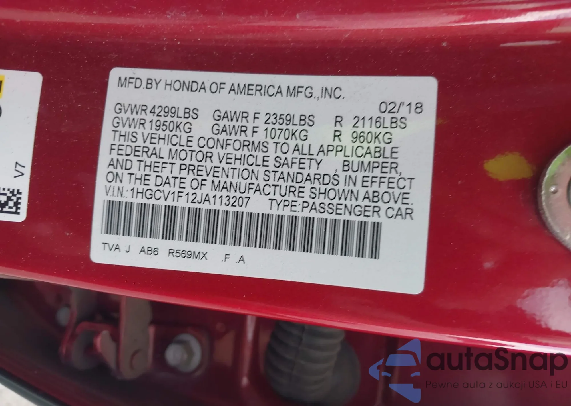 LOT: 43121026 VIN: 1HGCV1F12JA113207