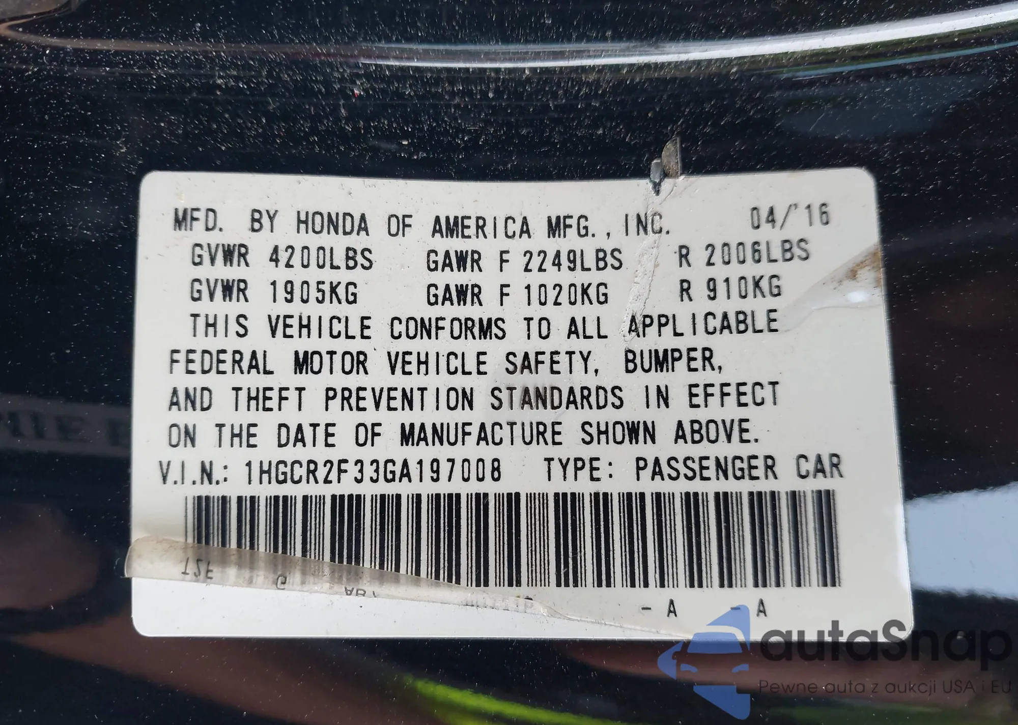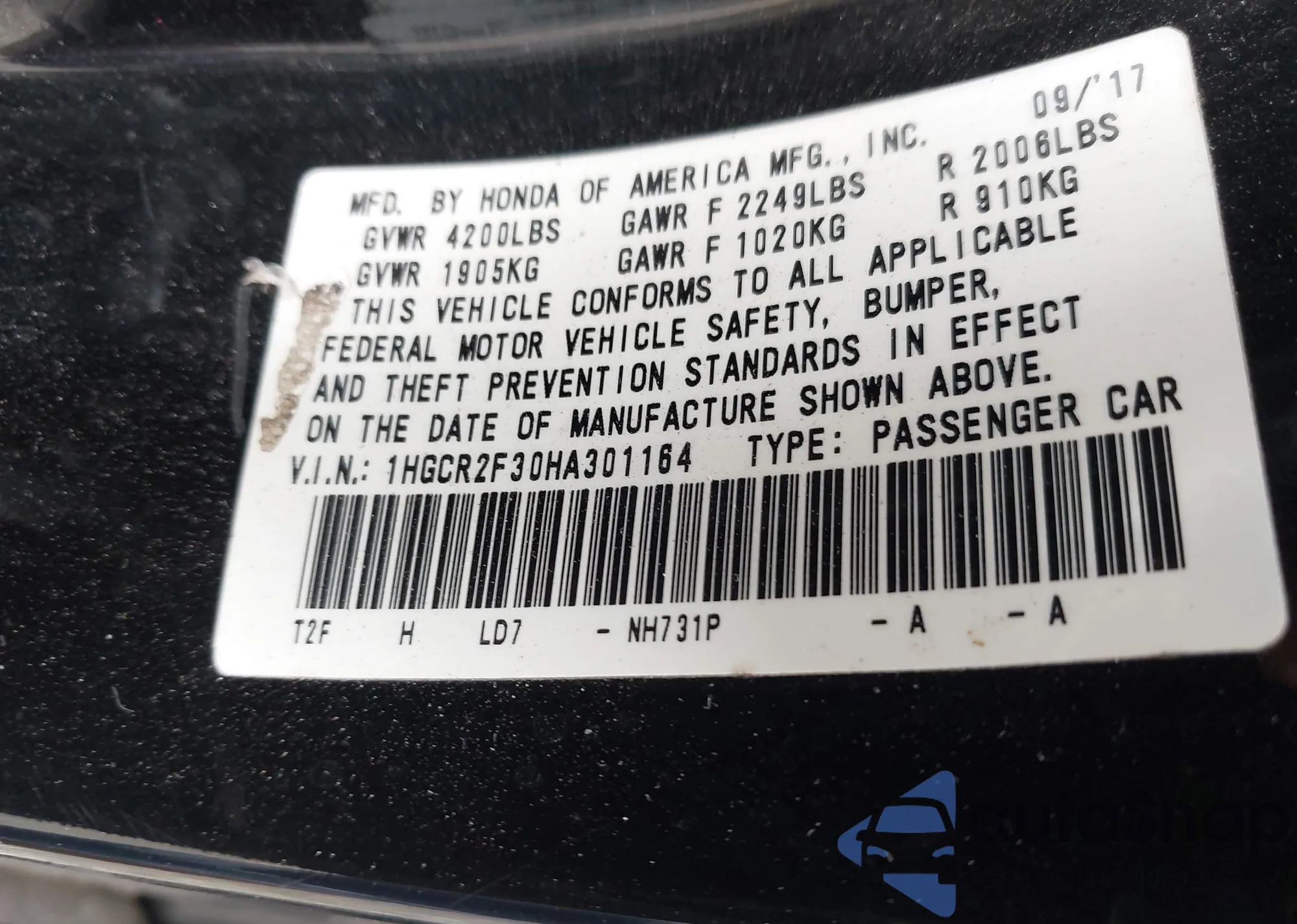 LOT: 43190818 VIN: 1HGCR2F30HA301164