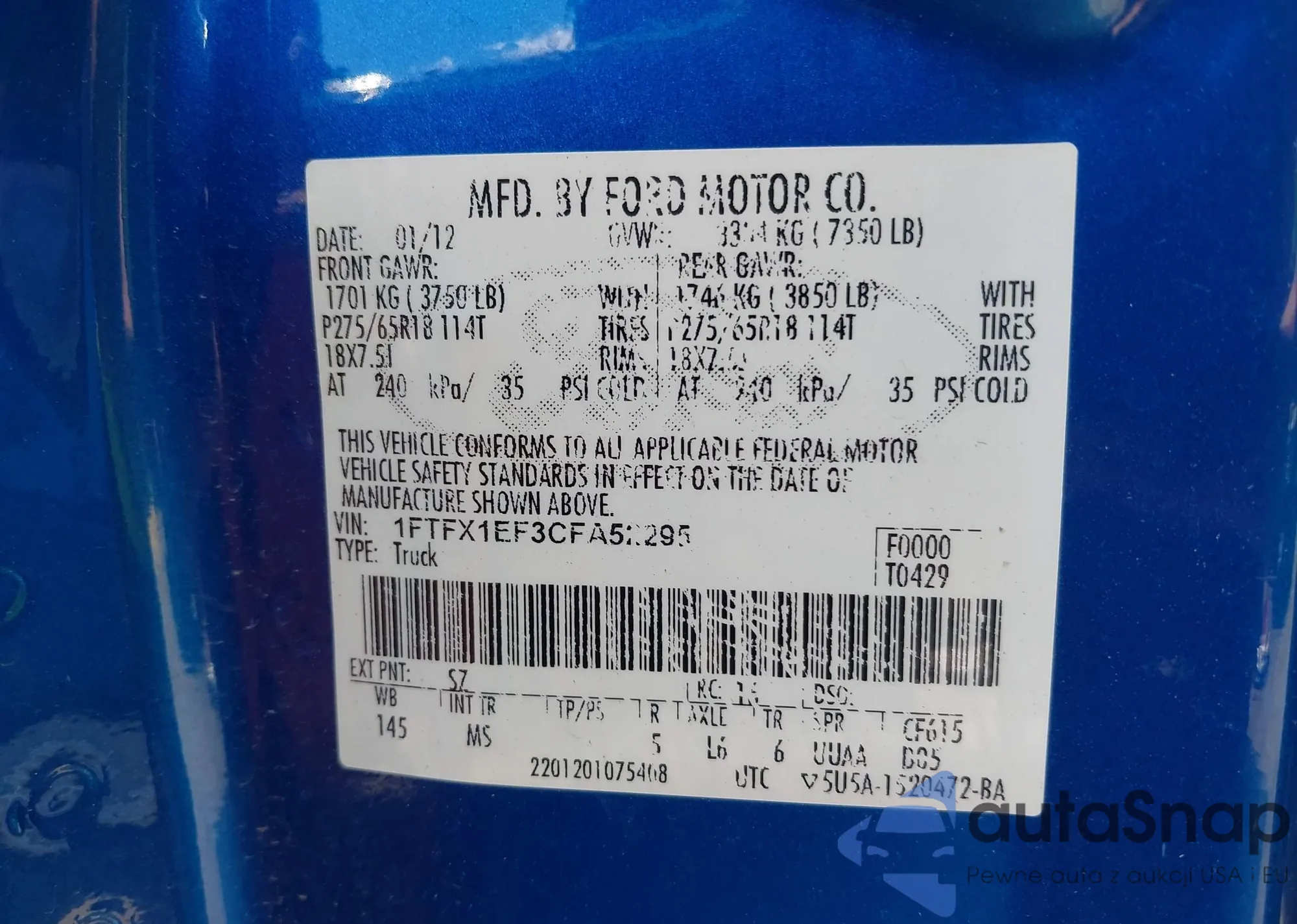 LOT: 43300347 VIN: 1FTPW14594KC43454