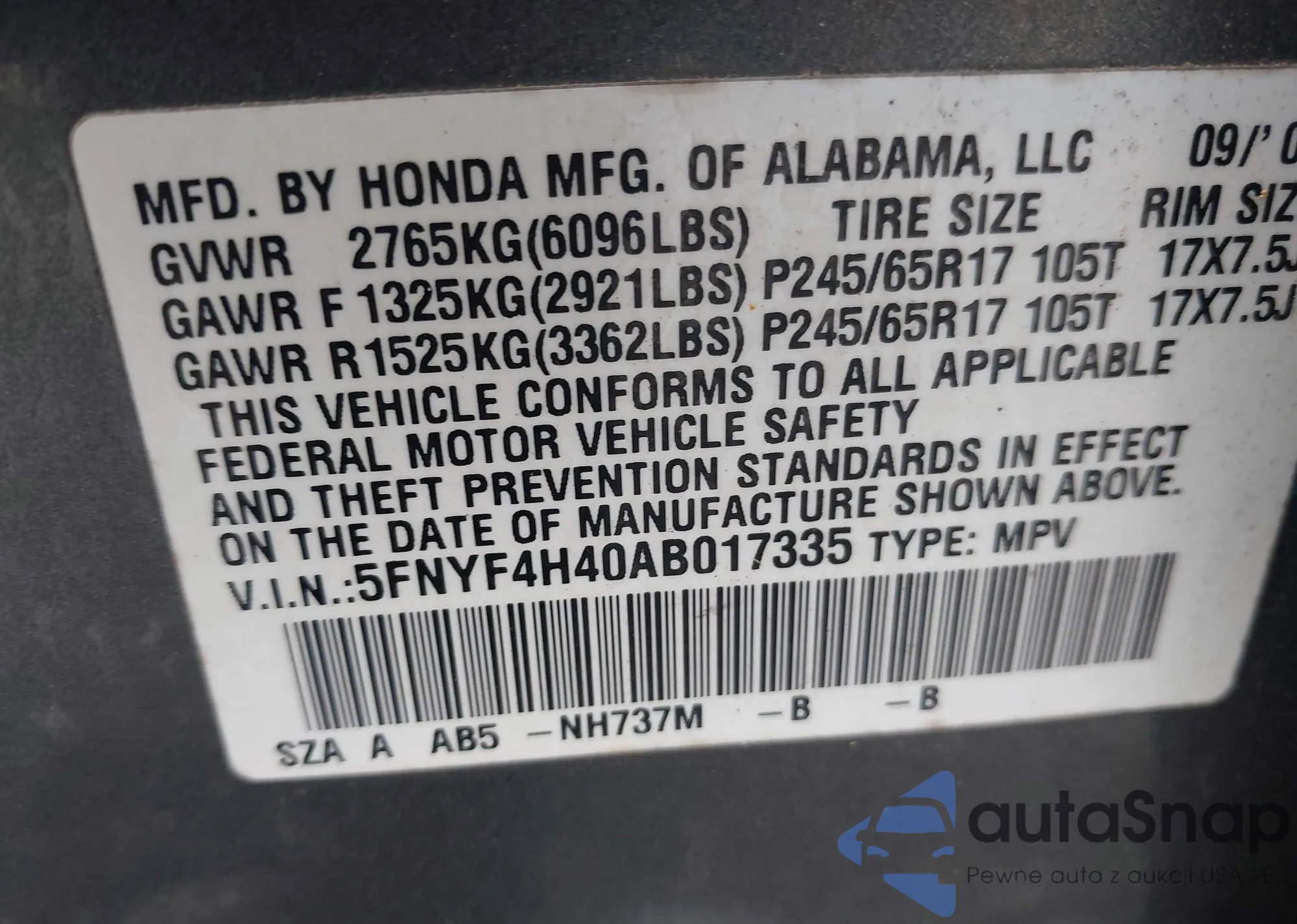 • VIN 5FNYF4H40AB017335