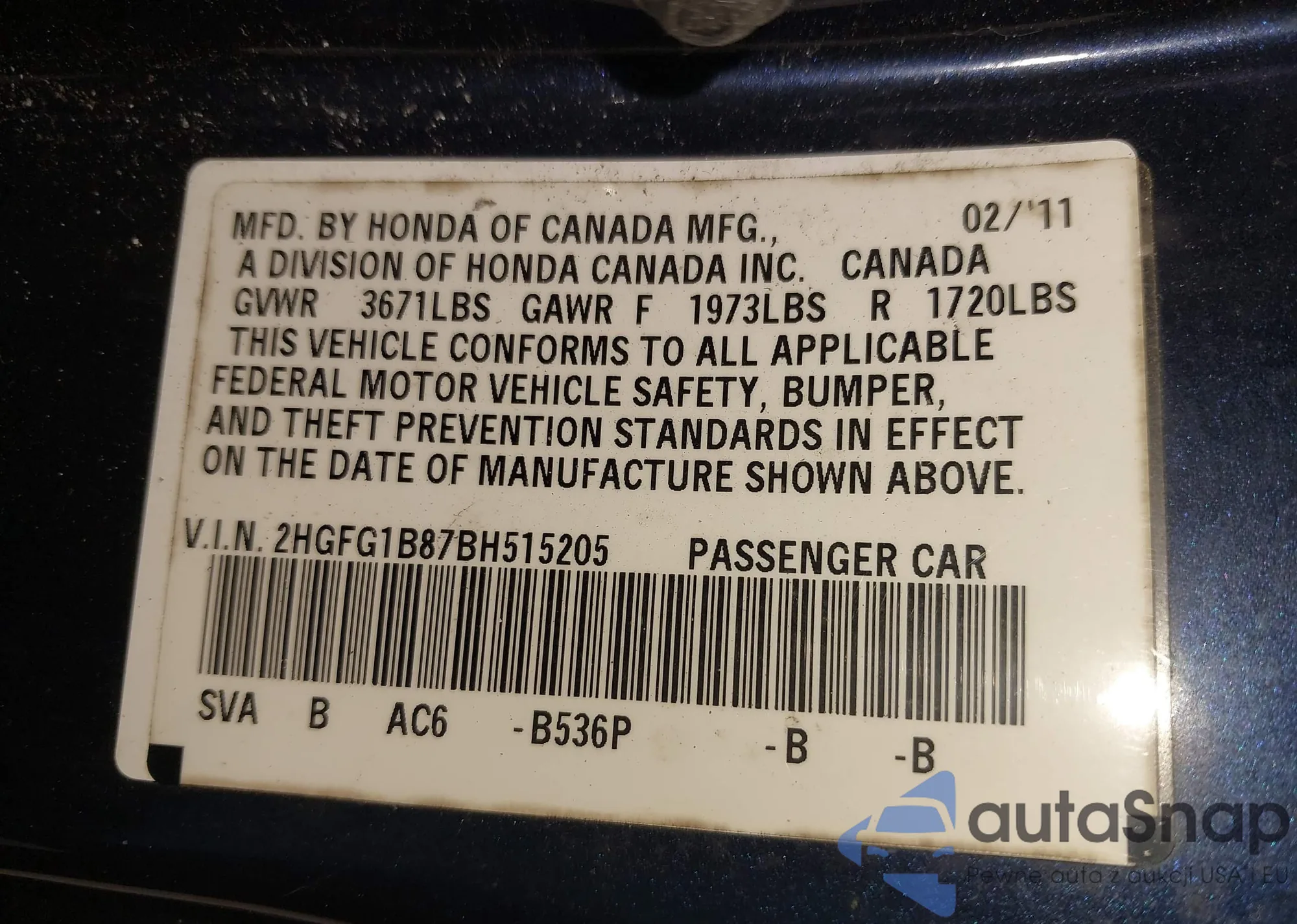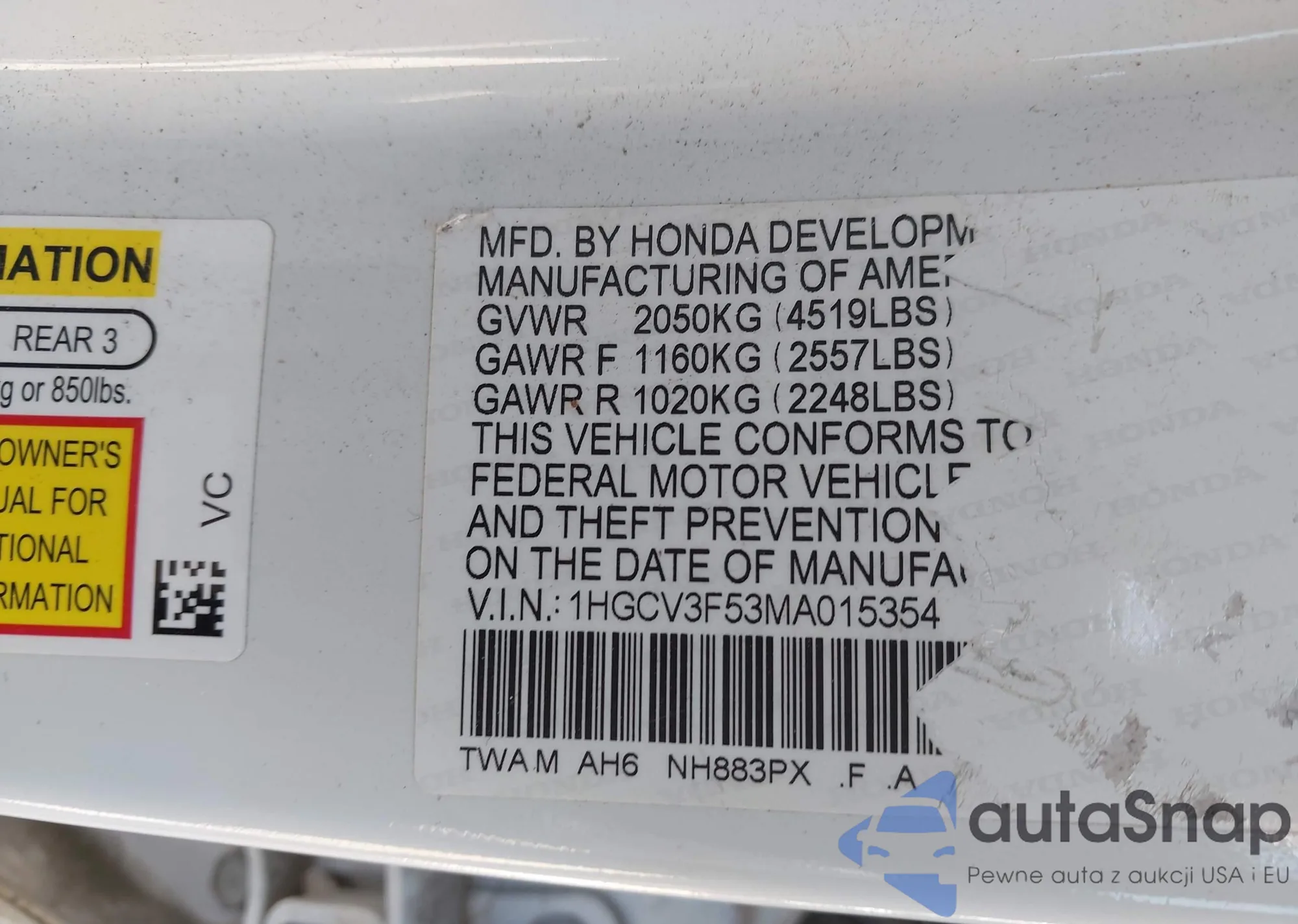 • VIN 1HGCV3F53MA015354