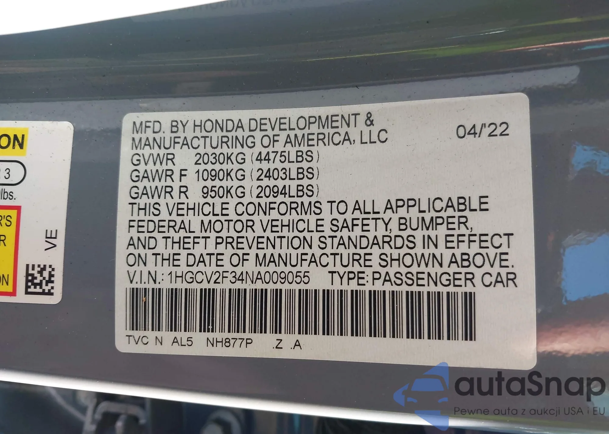 LOT: 43194272 VIN: 1HGCV2F34NA009055