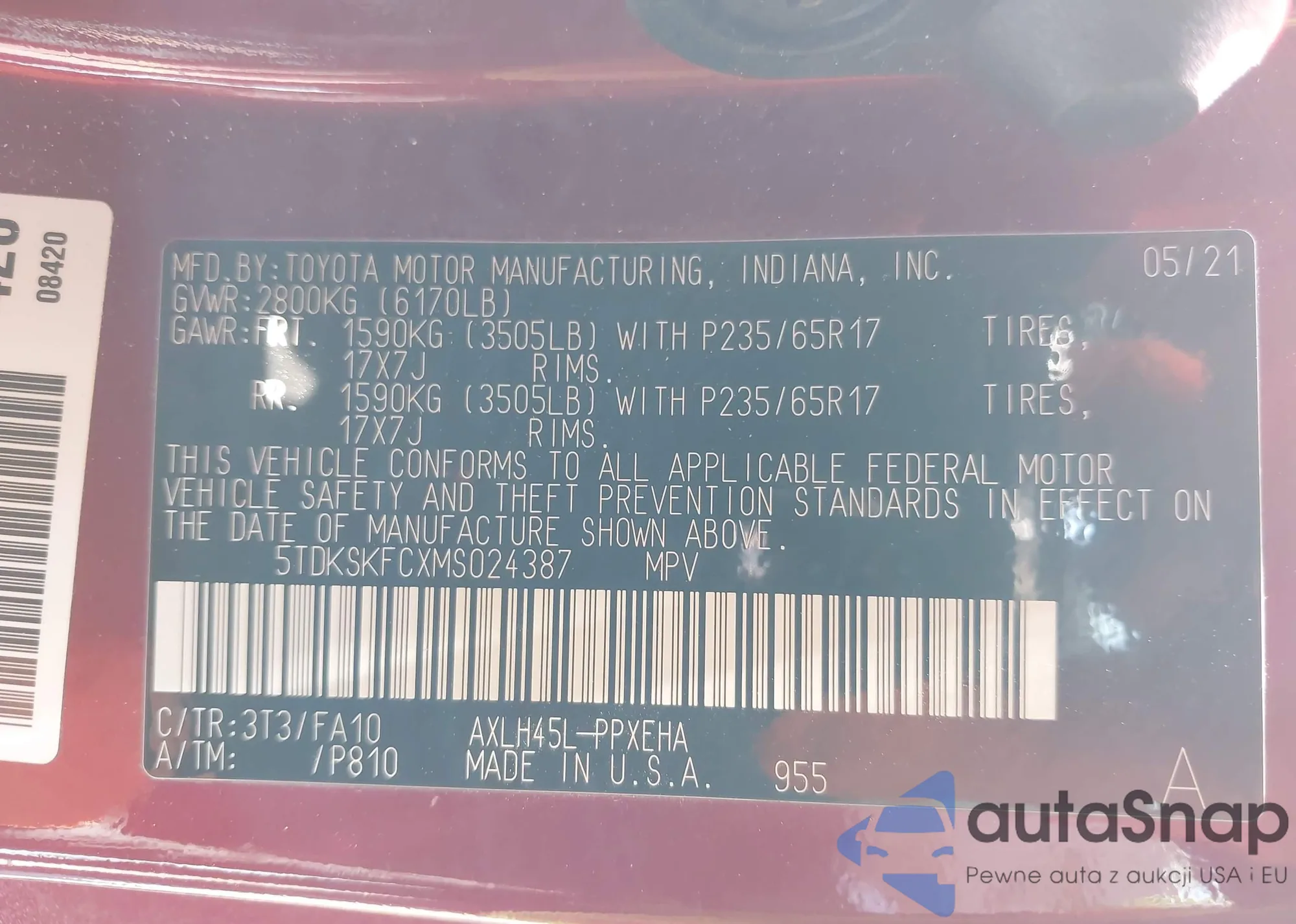 LOT: 43225400 VIN: 5TDKSKFCXMS024387