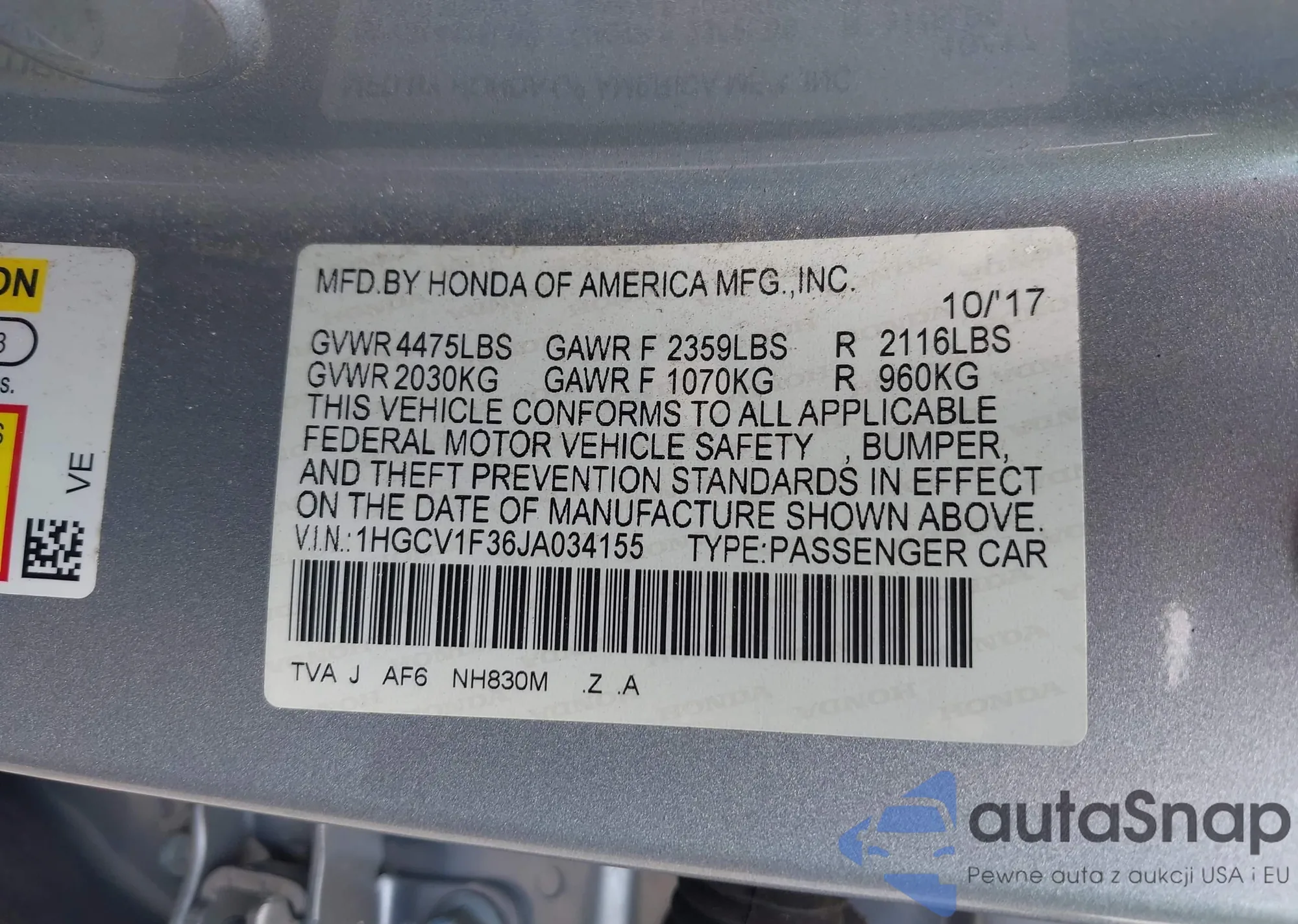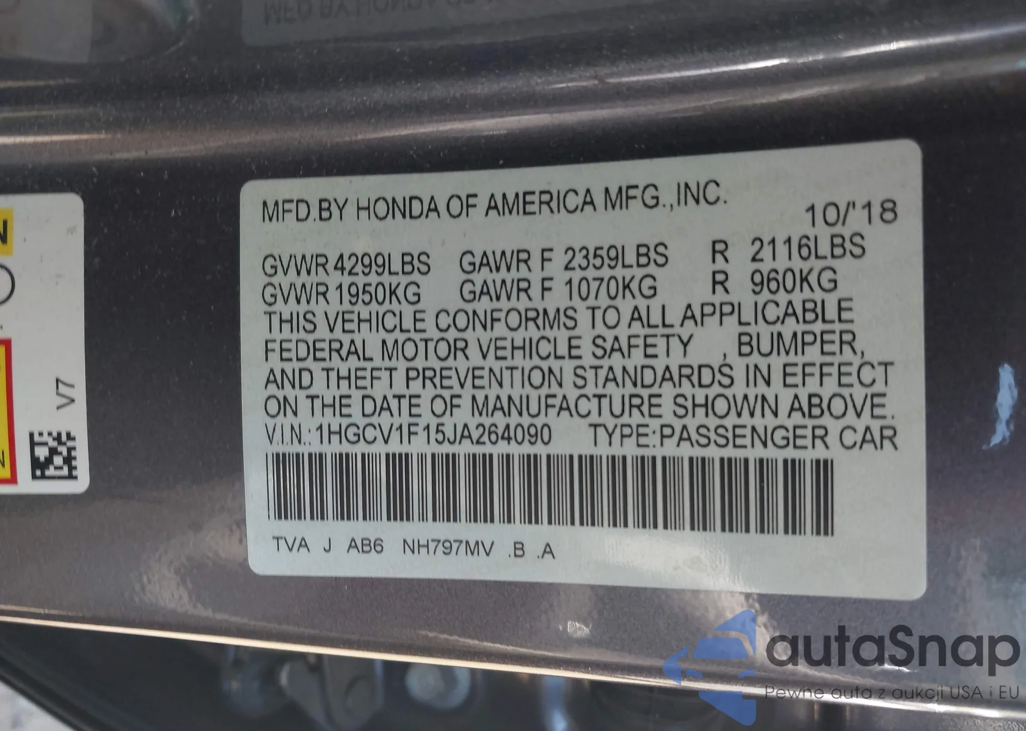 LOT: 43133070 VIN: 1HGCV1F15JA264090