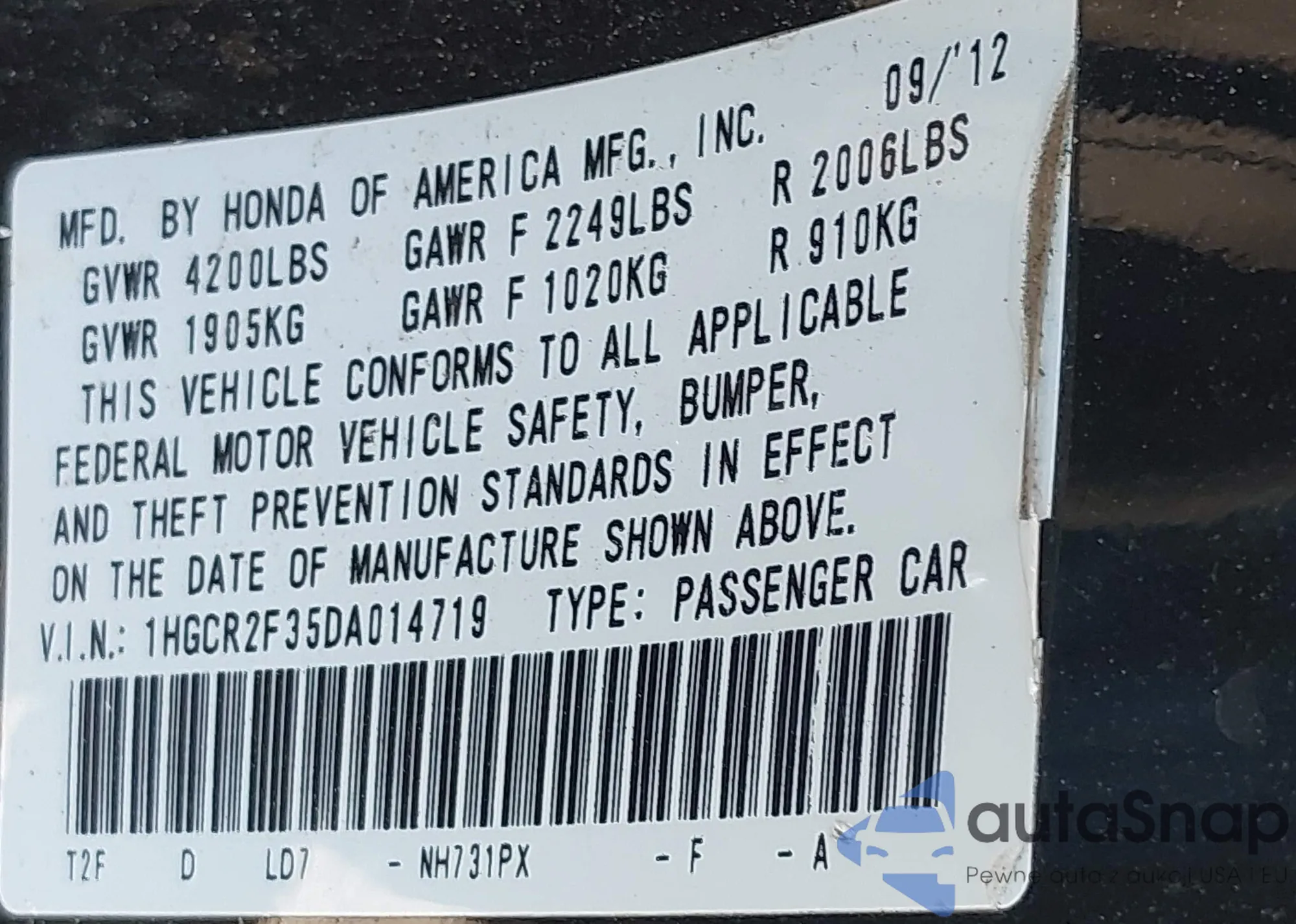 LOT: 43167516 VIN: 1HGCR2F35DA014719