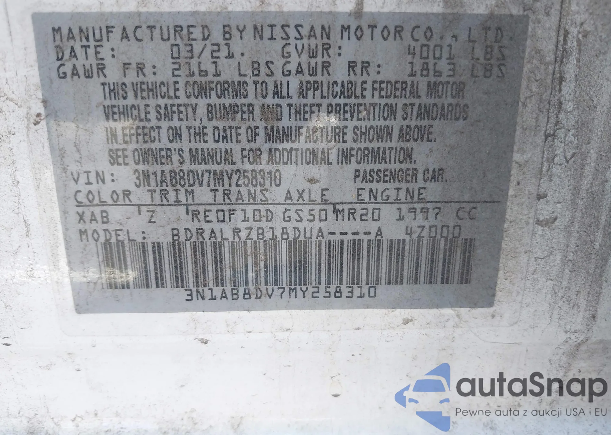 • VIN 3N1AB8DV7MY258310