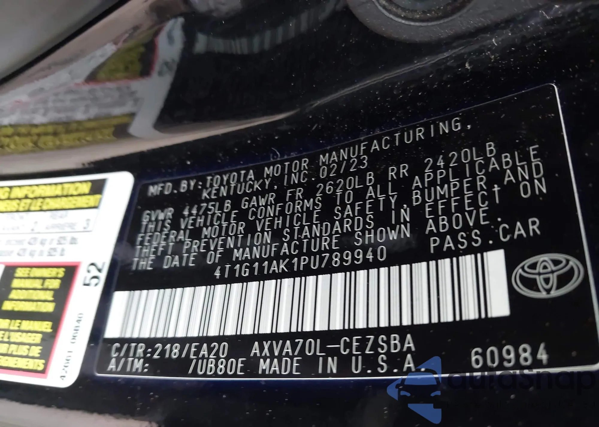 LOT: 43051447 VIN: 4T1G11AK1PU789940
