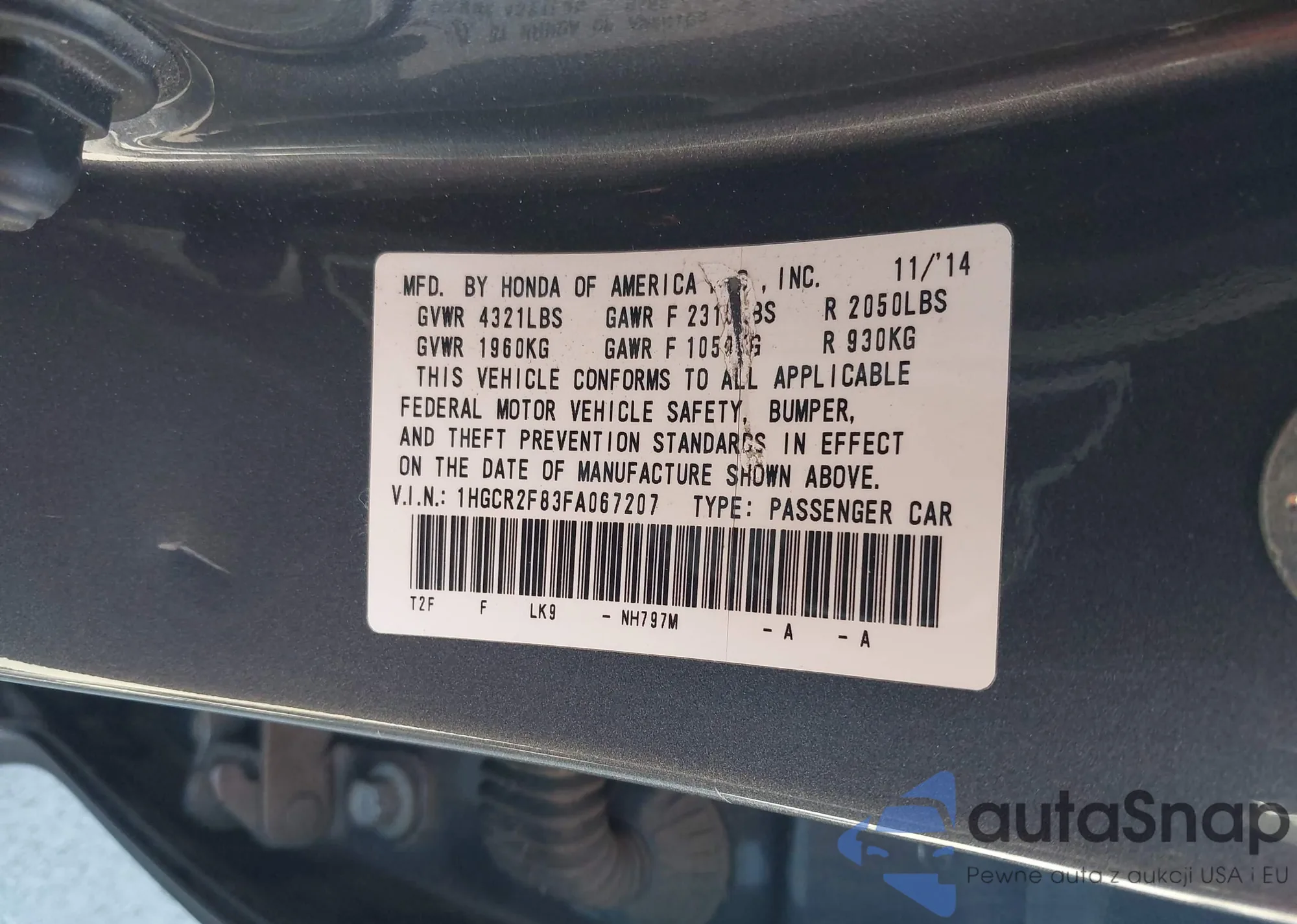 LOT: 43502146 VIN: 1HGCR2F83FA067207