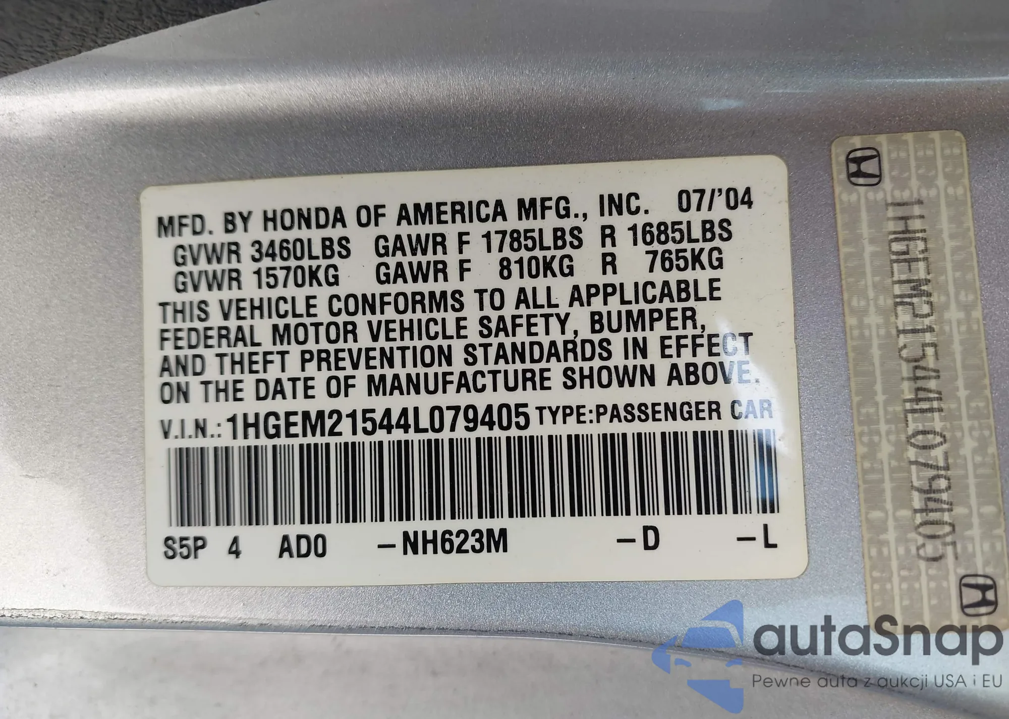 LOT: 42779429 VIN: 1HGEM21544L079405