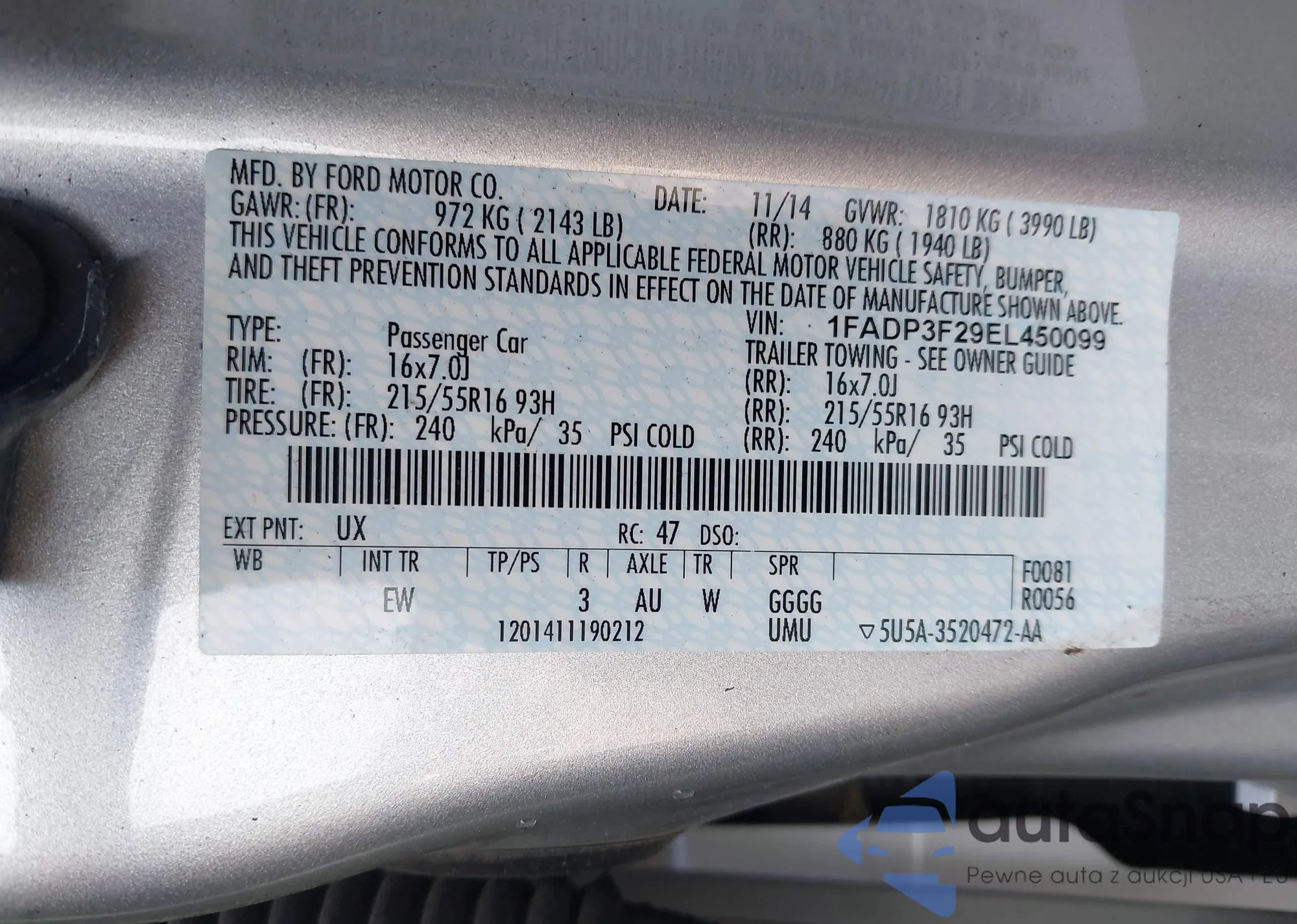 LOT: 42719299 VIN: 1FADP3F29EL450099