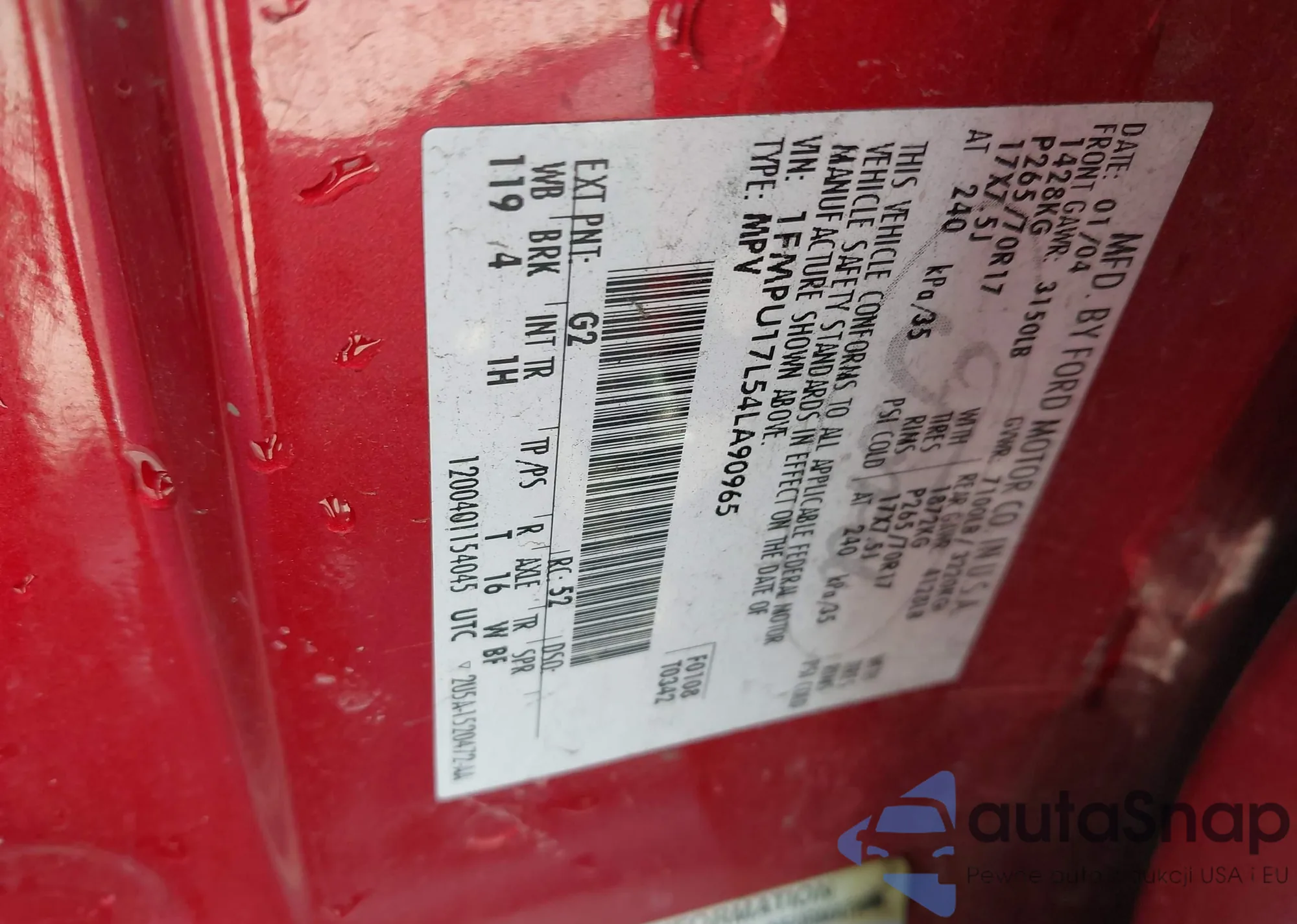• VIN 1FMPU17L54LA90965