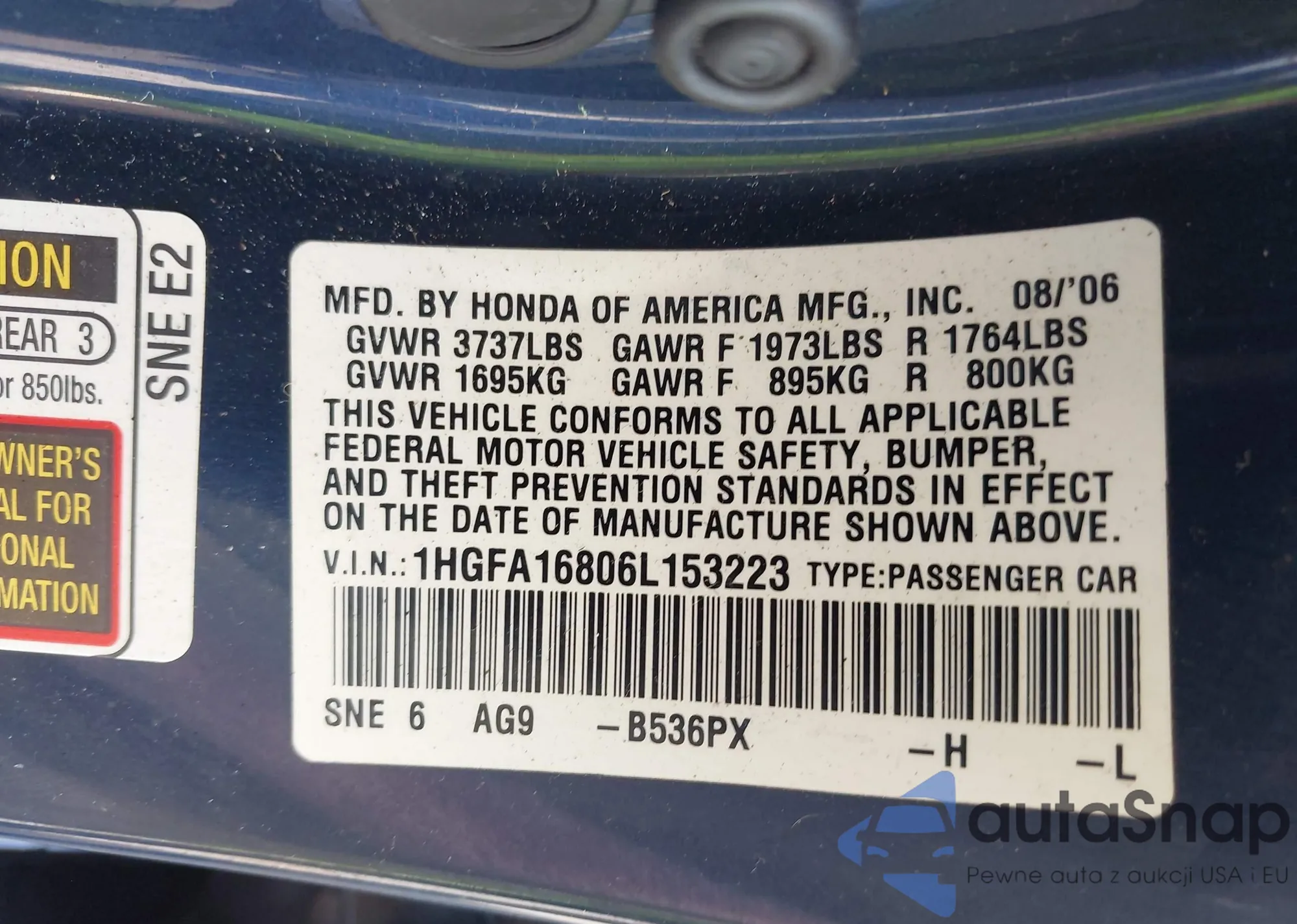 LOT: 43026977 VIN: 1HGFA16806L153223