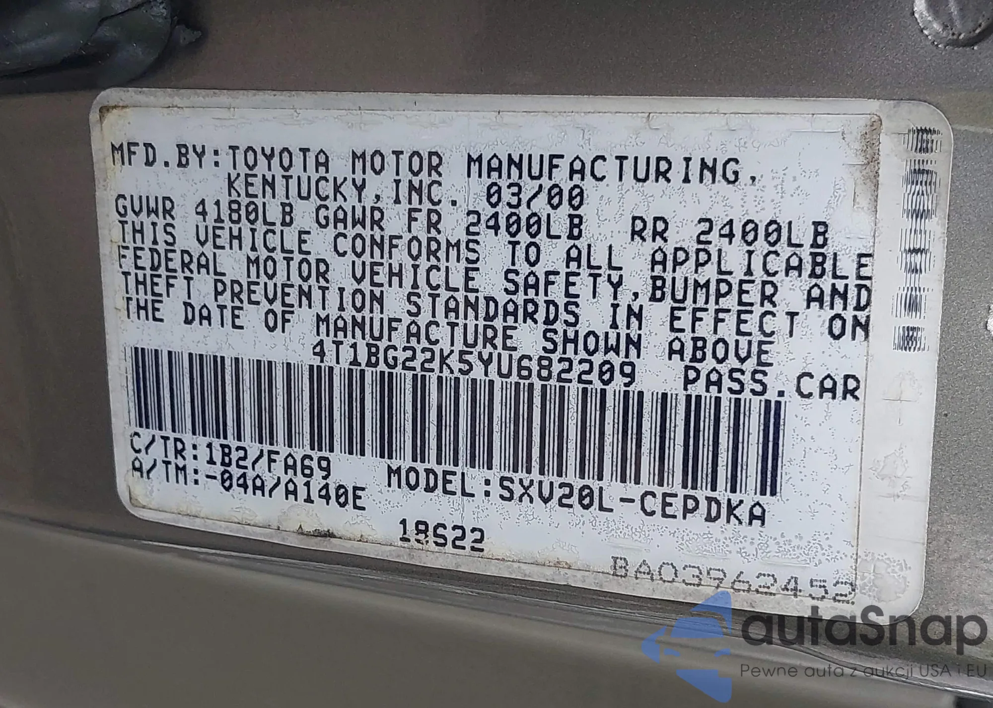 LOT: 43289554 VIN: 4T1BG22K5YU682209