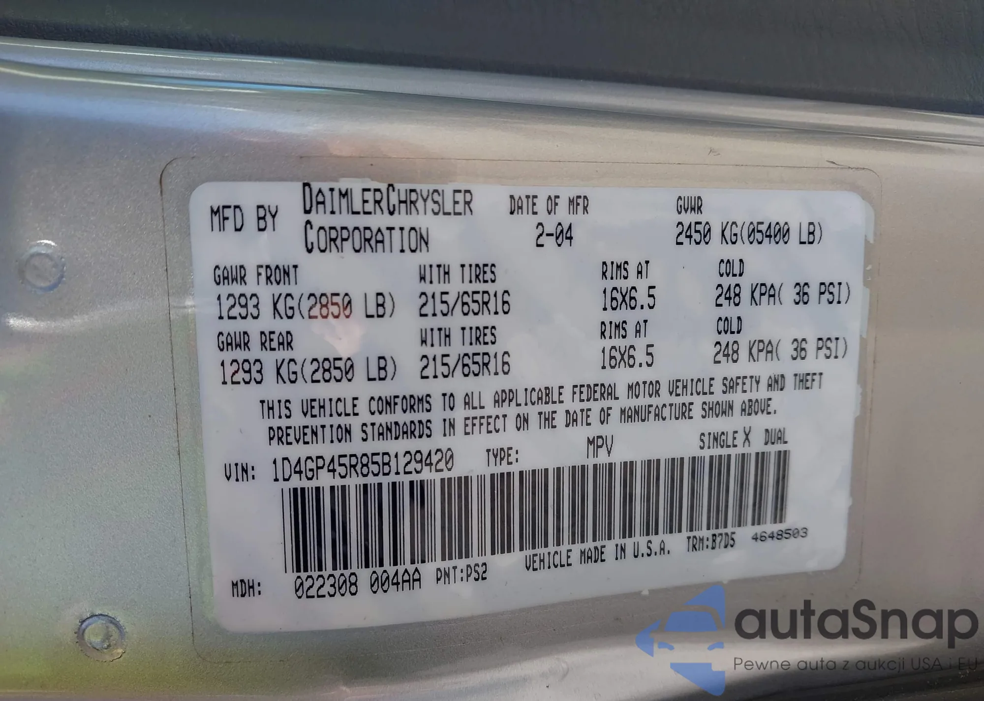 LOT: 43536370 VIN: 1D4GP45R85B129420