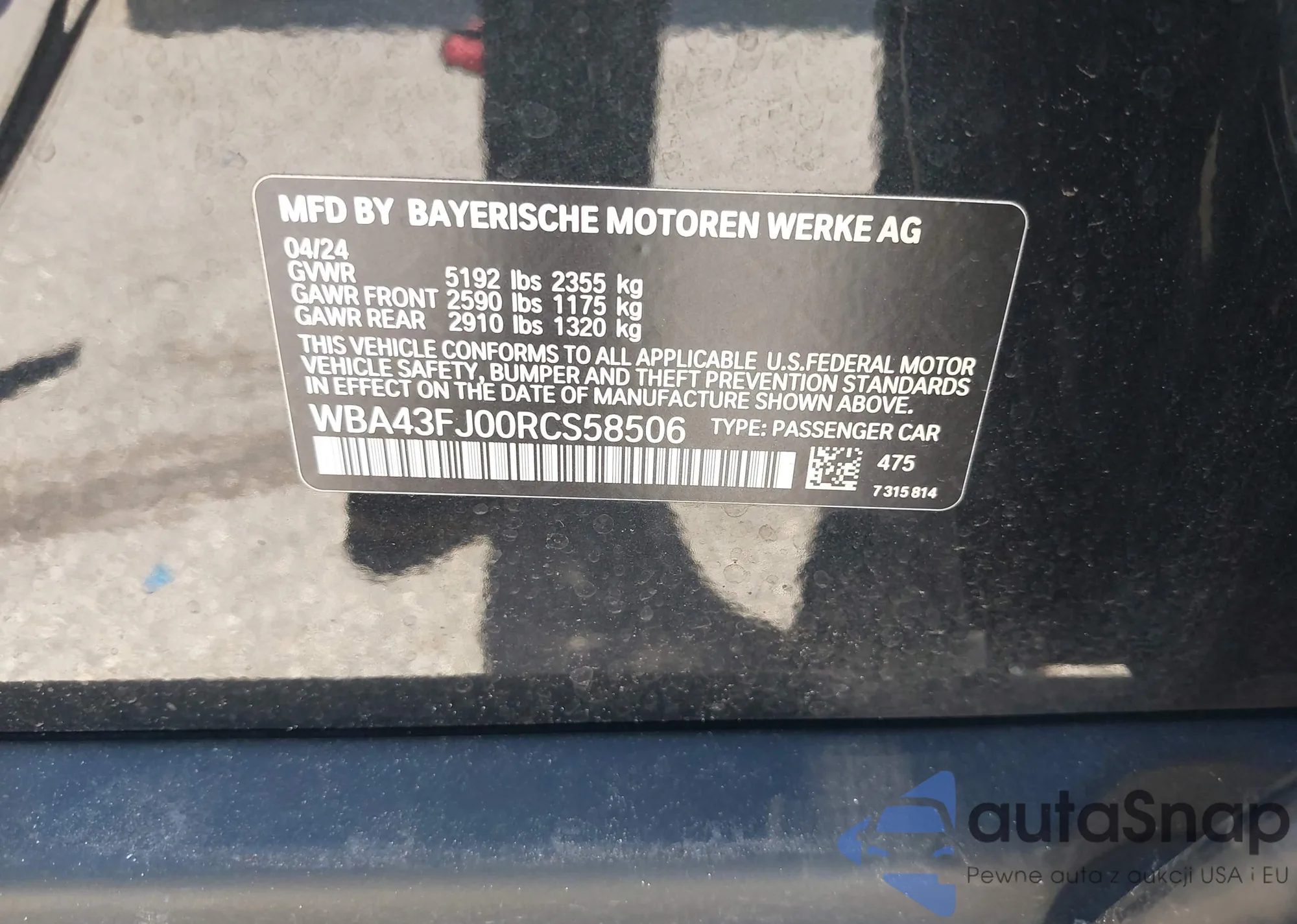 LOT: 43339817 VIN: WBA43FJ00RCS58506