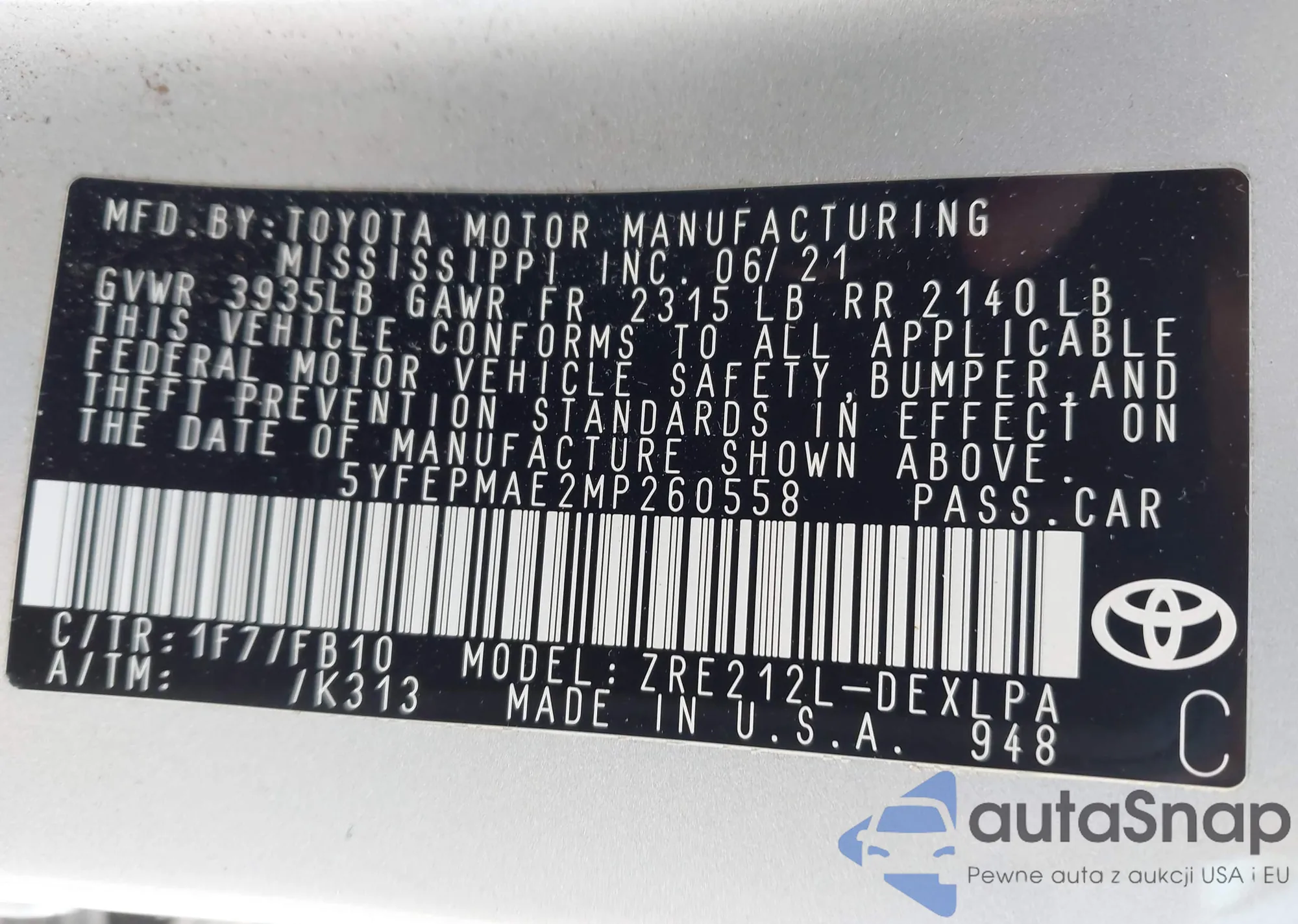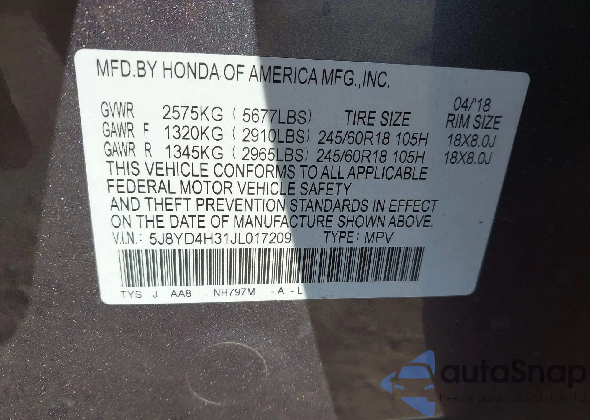 • VIN 5J8YD4H31JL017209