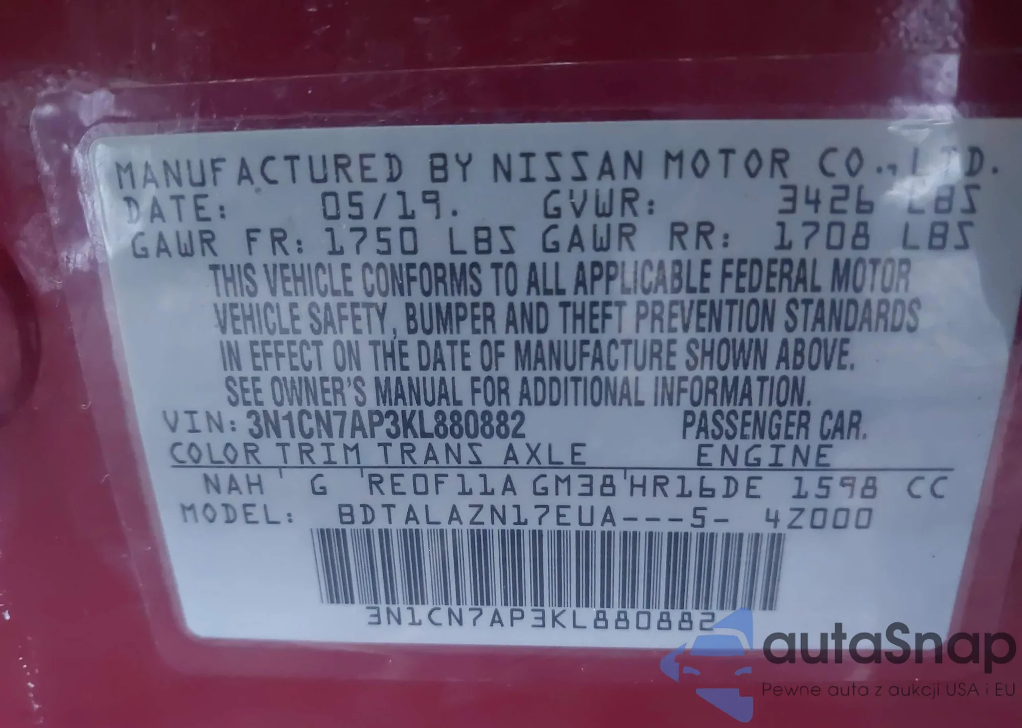 LOT: 43478947 VIN: 3N1CN7AP3KL880882