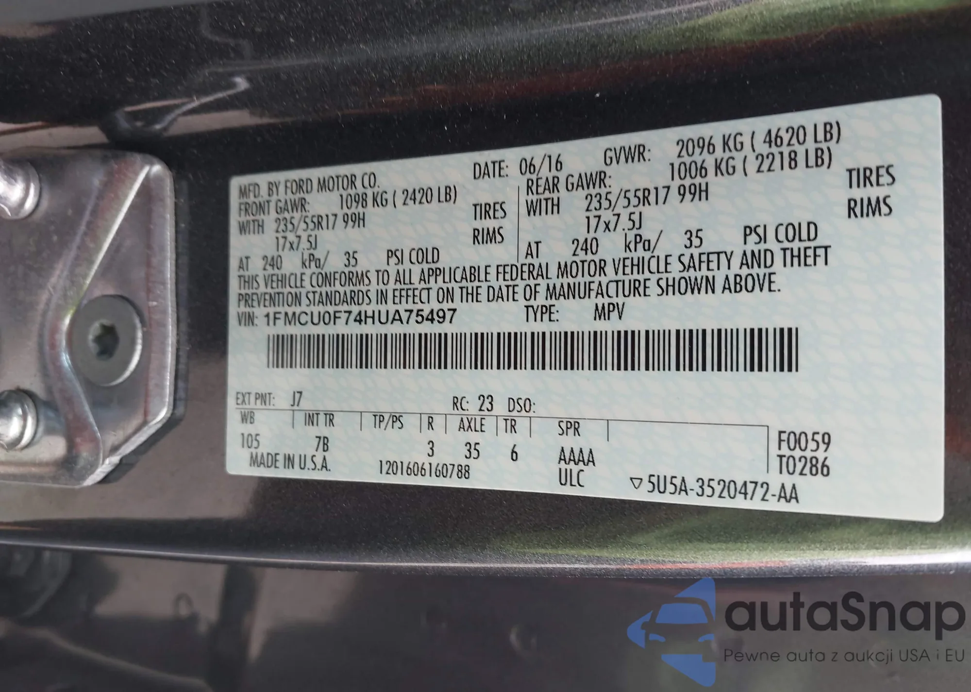 • VIN 1FMCU0F74HUA75497
