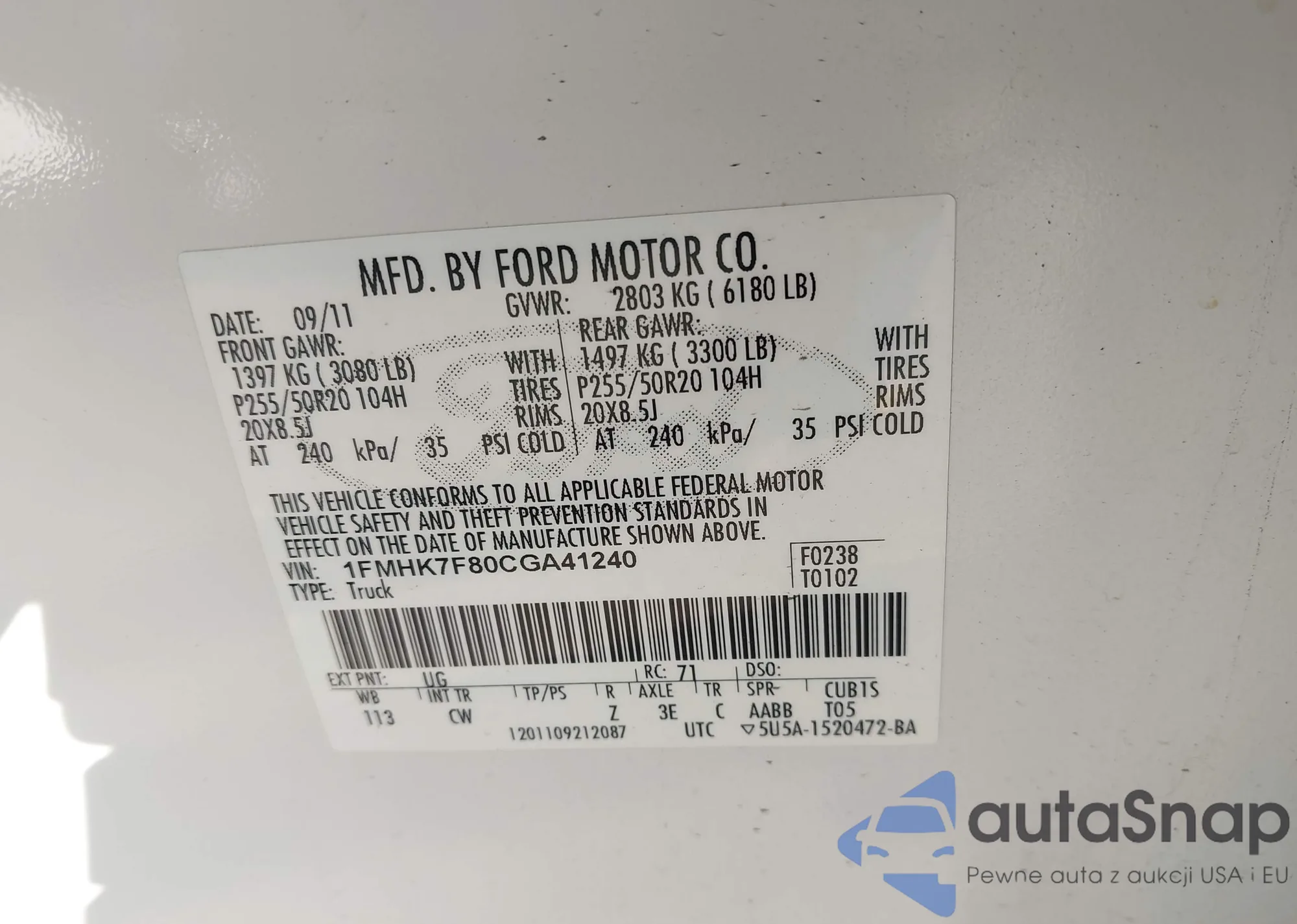 LOT: 43534575 VIN: 1FMHK7F80CGA41240