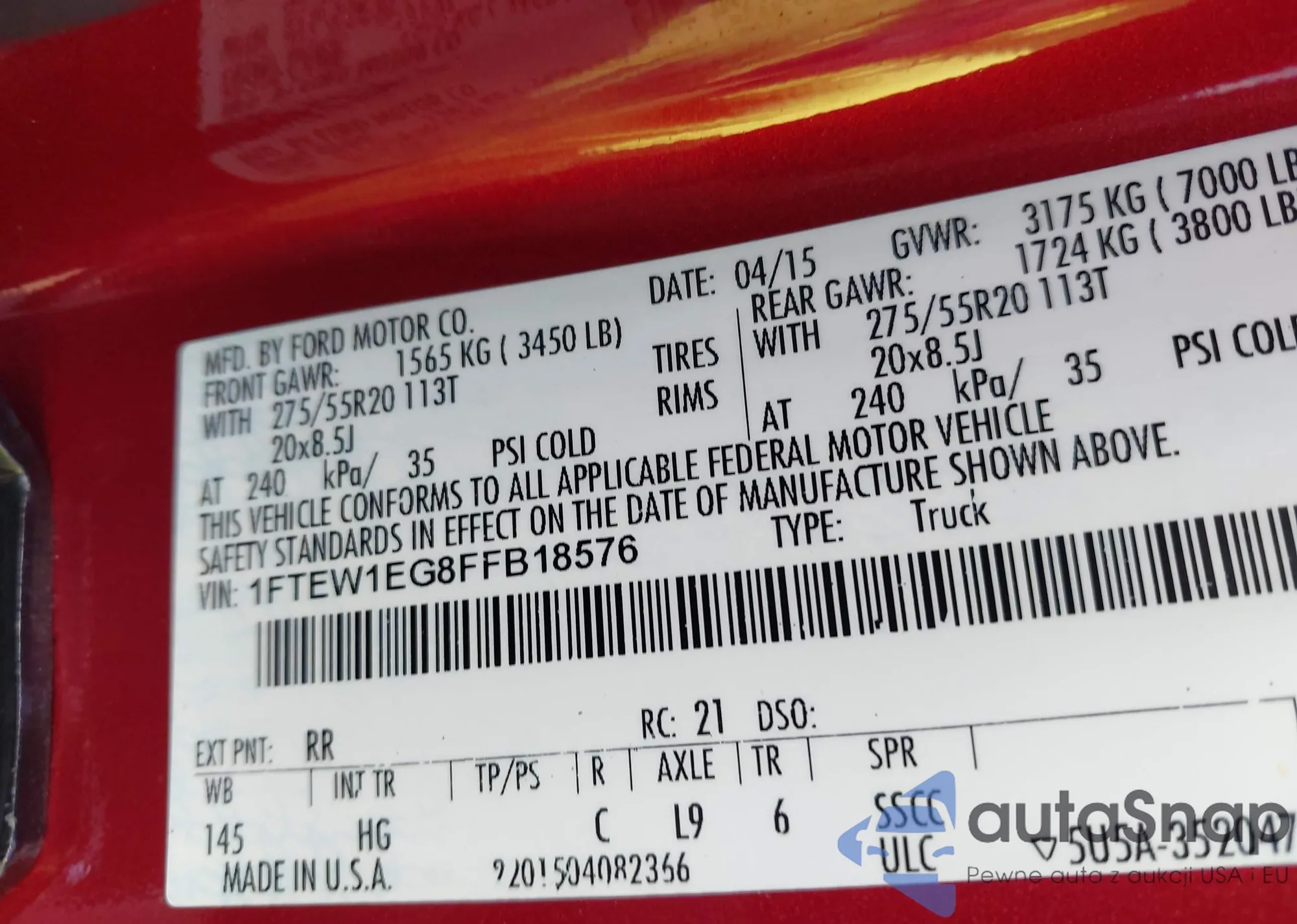 LOT: 43381145 VIN: 1FTEW1EG8FFB18576