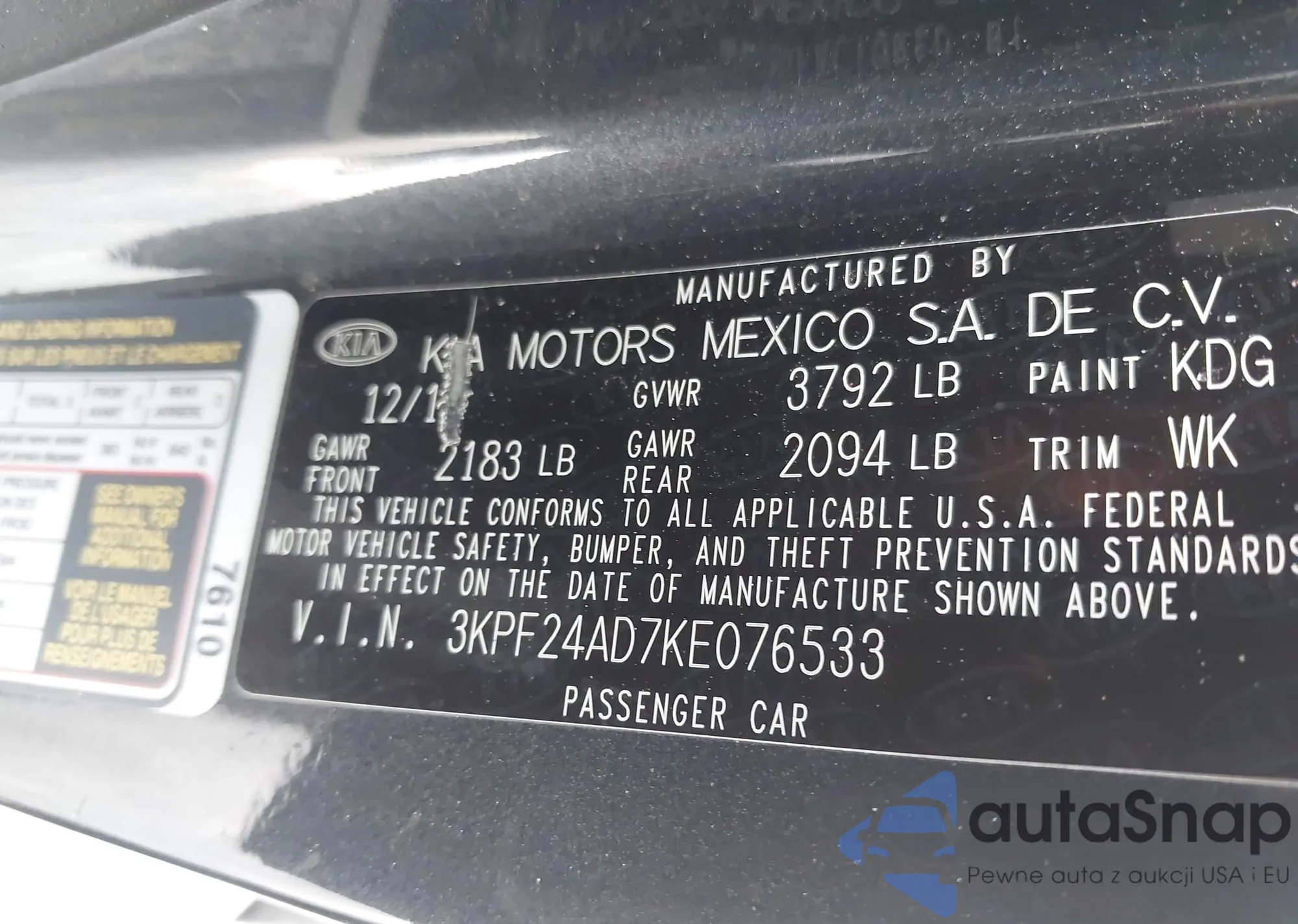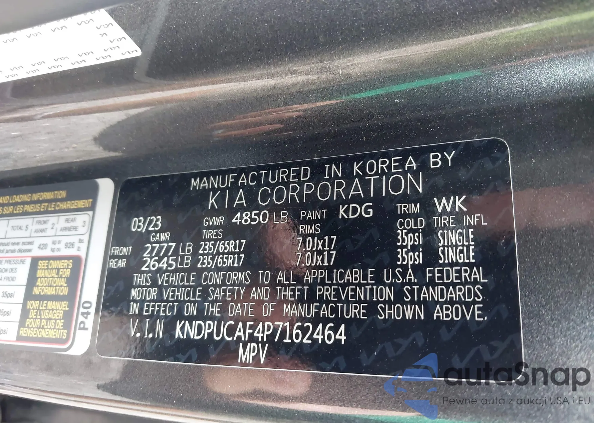 LOT: 43017688 VIN: KNDPUCAF4P7162464