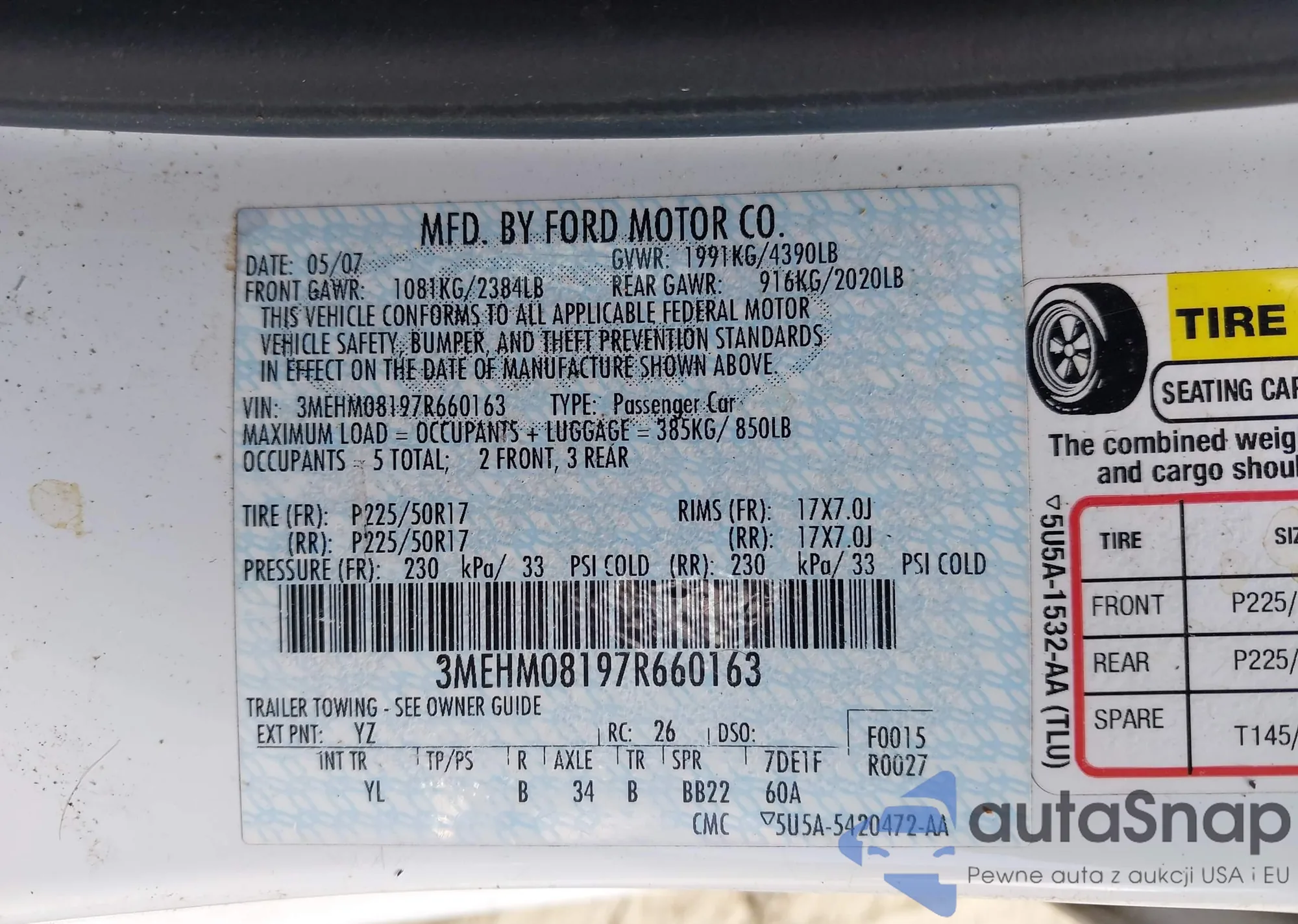 2007 Mercury Milan V6 Premier z USA, uszkodzony, nr VIN 3MEHM08197R660163
