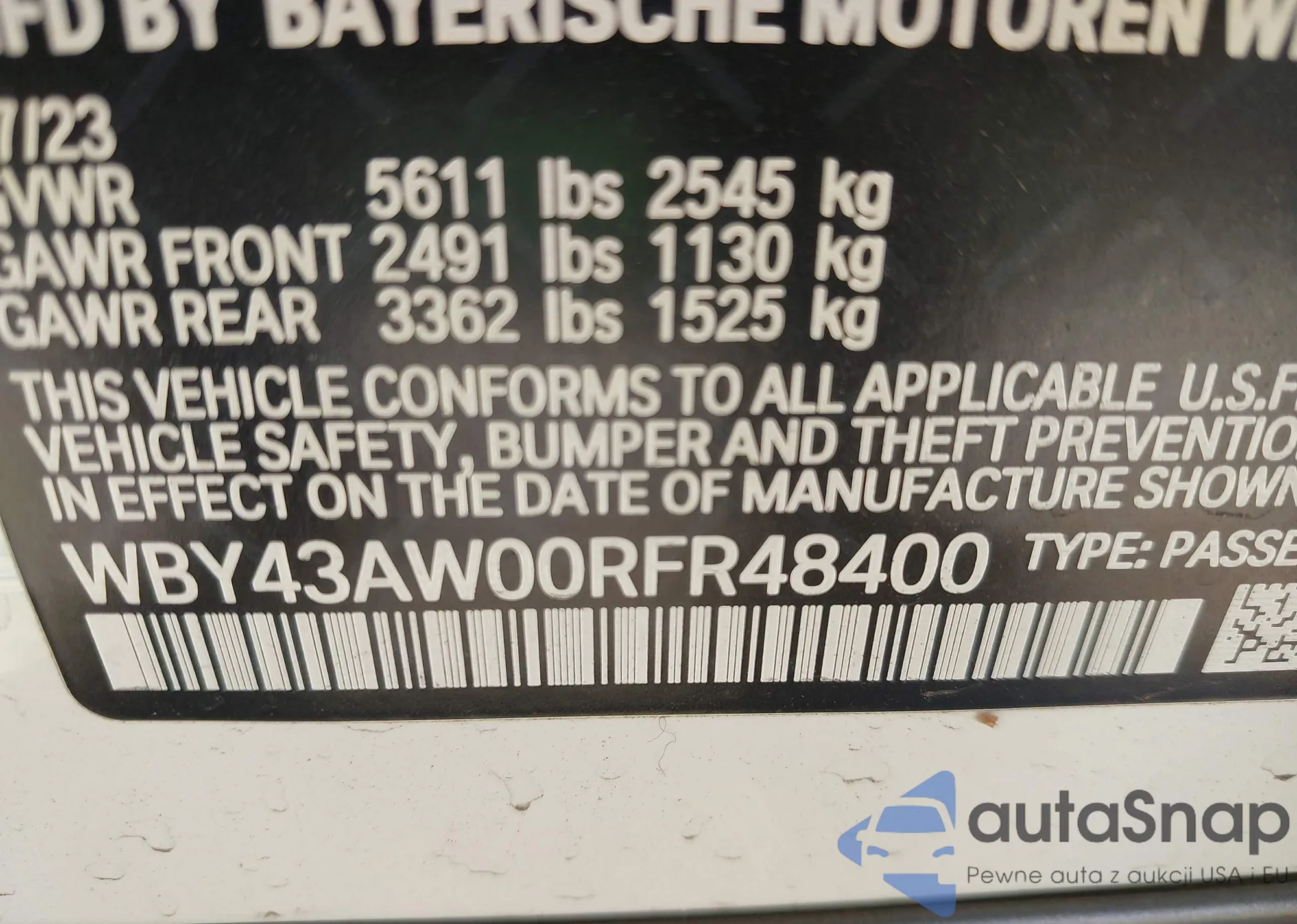 LOT: 43351420 VIN: WBY43AW00RFR48400