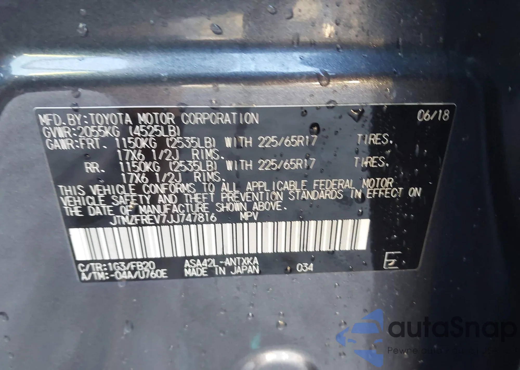 LOT: 43433520 VIN: JTMZFREV7JJ747816