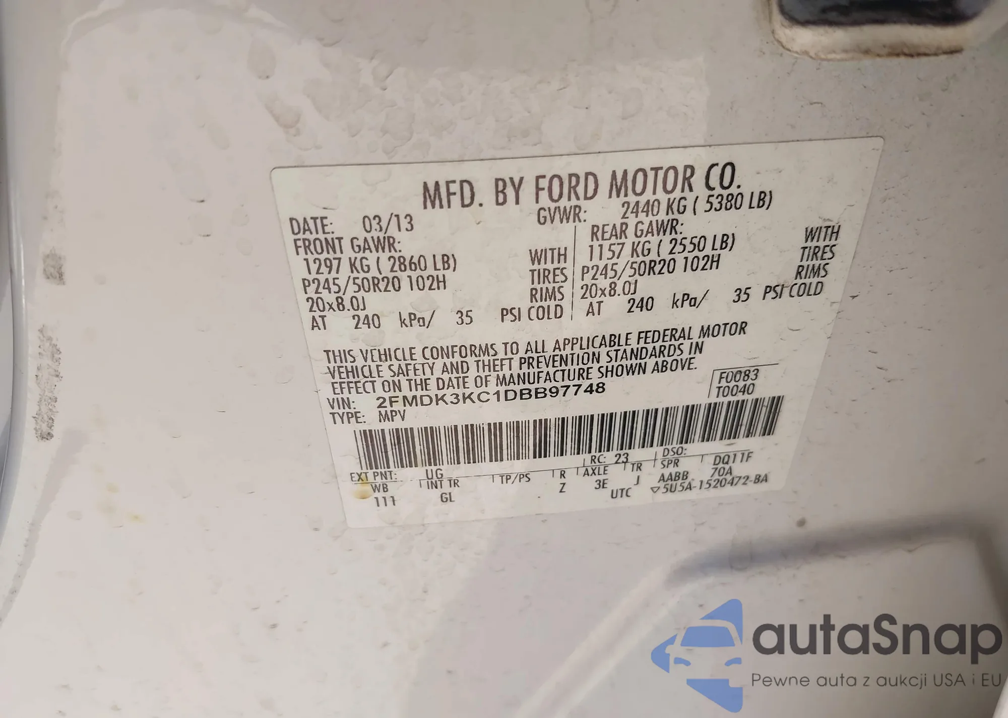 LOT: 43635861 VIN: 2FMDK3KC1DBB97748