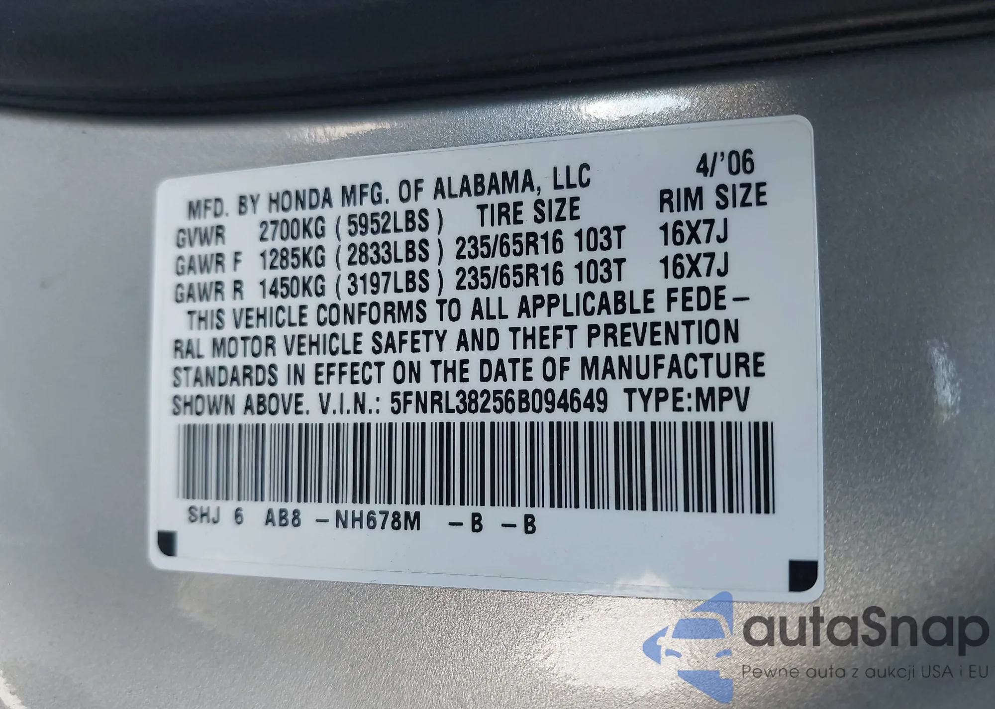 • VIN 5FNRL38256B094649
