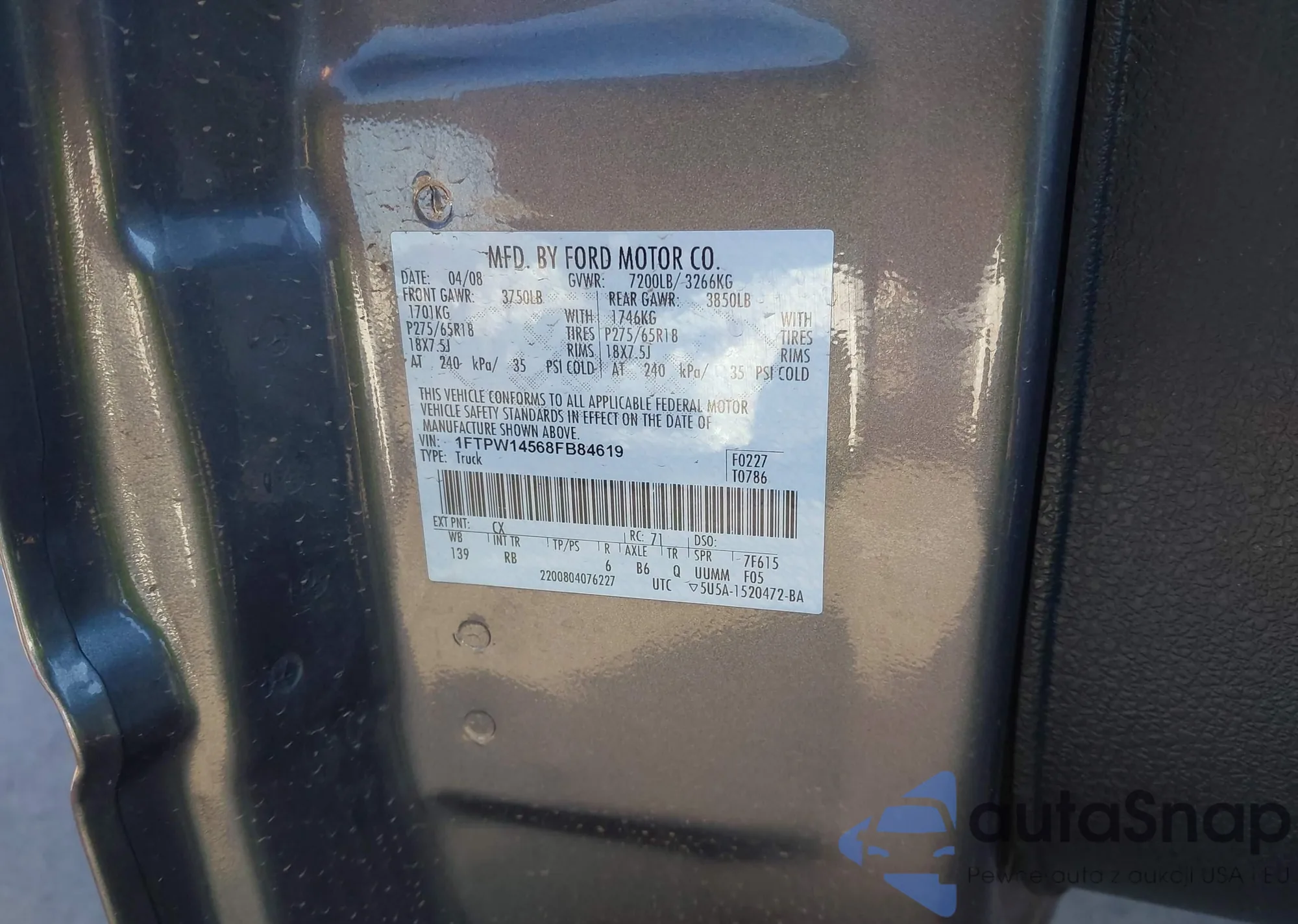 LOT: 43465985 VIN: 1FTPW14568FB84619