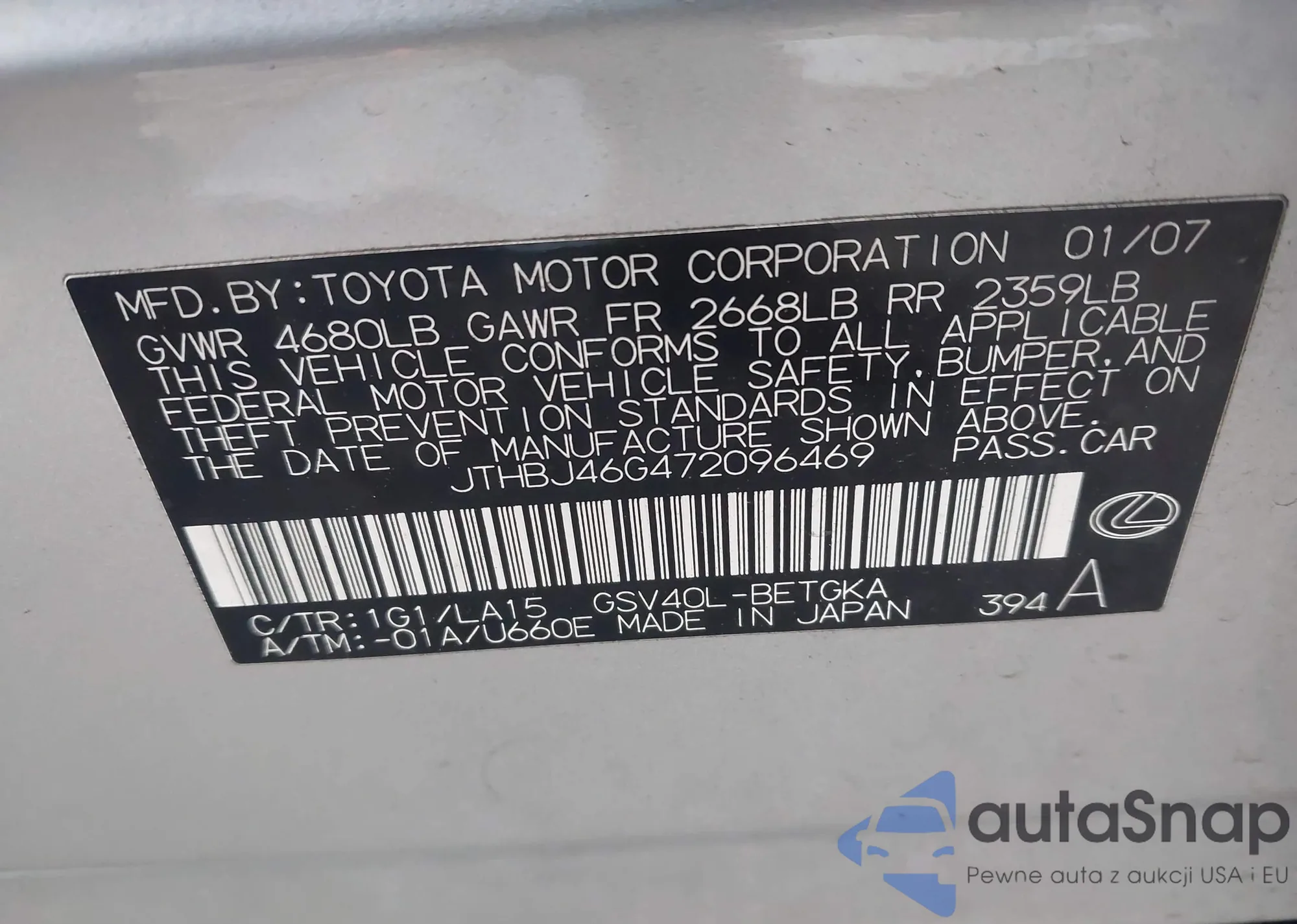 2007 Lexus Es 350 z USA, uszkodzony, nr VIN JTHBJ46G472096469