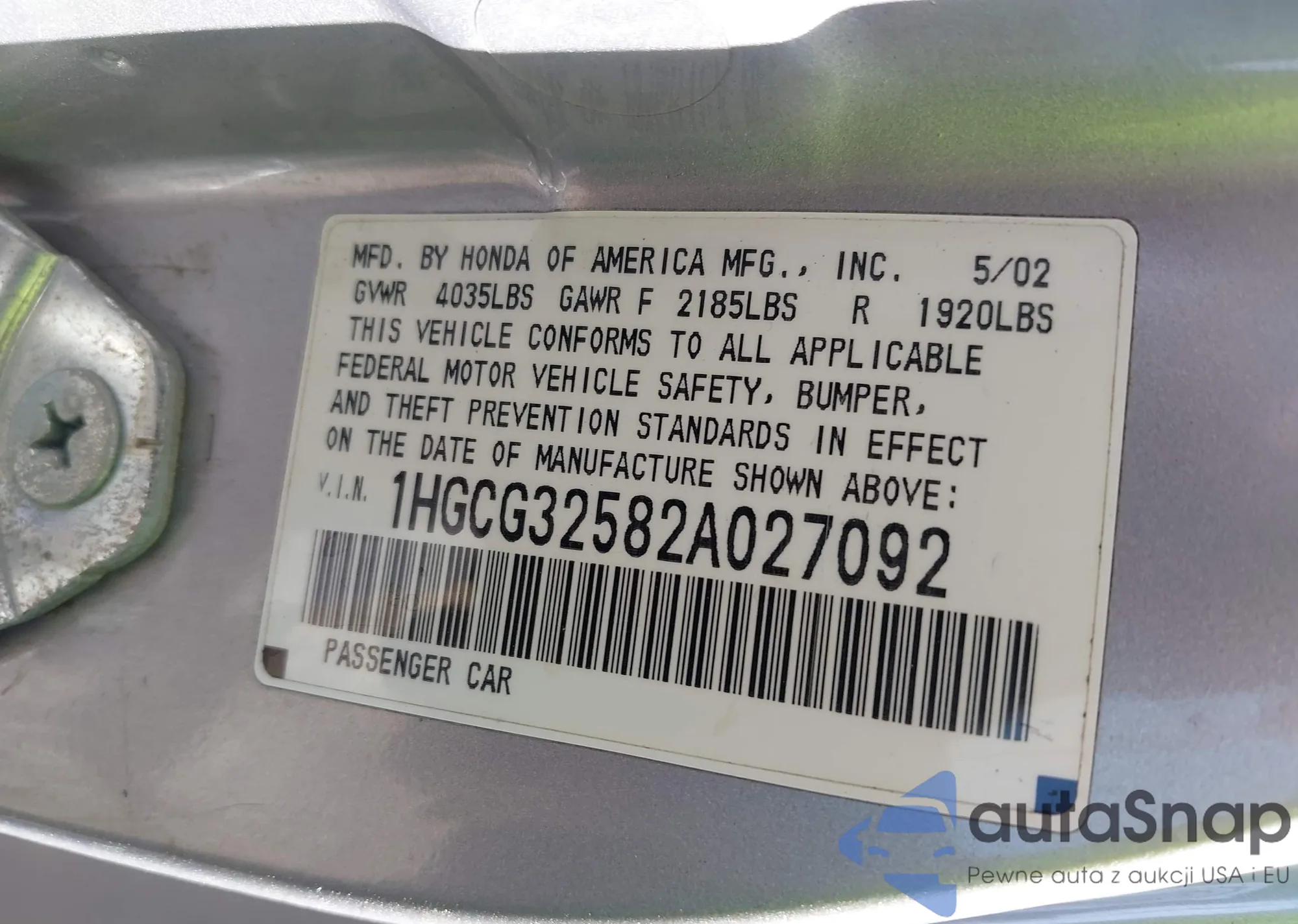 LOT: 43662099 VIN: 1HGCG32582A027092
