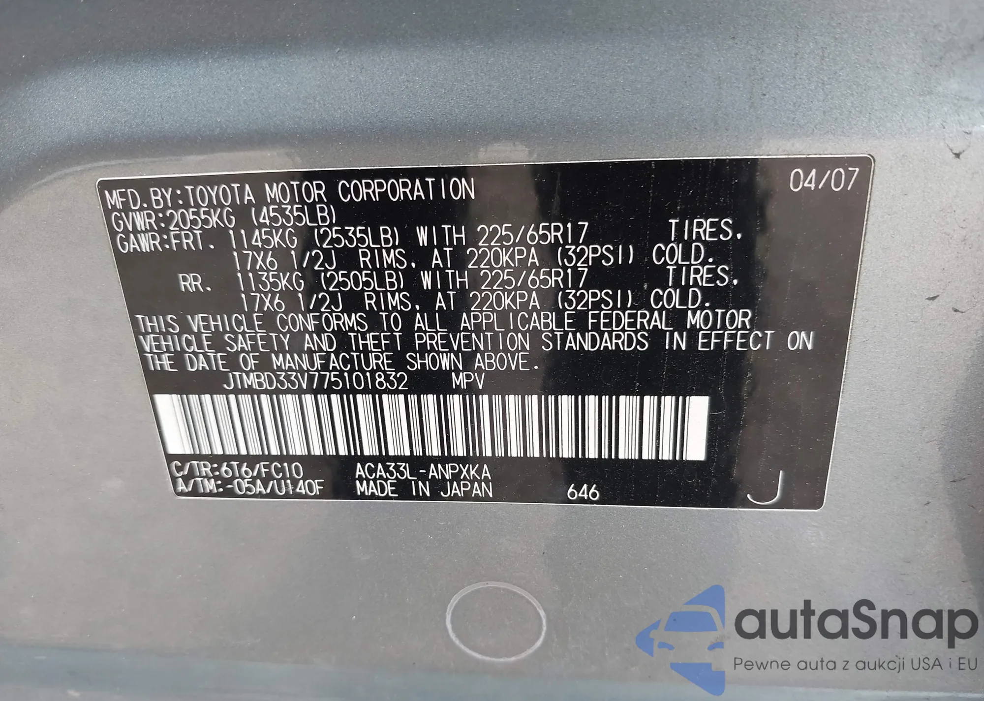 LOT: 42354730 VIN: JTMBD33V775101832