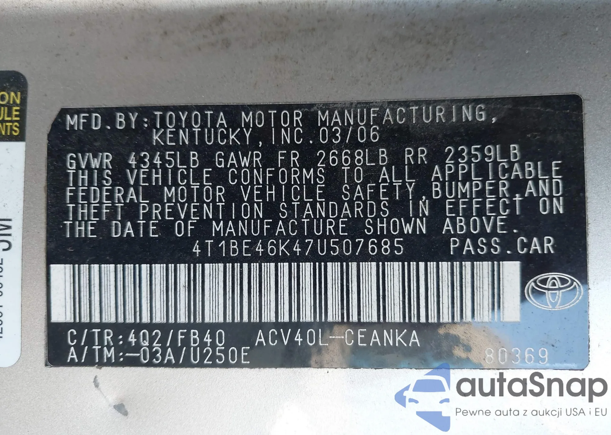 • VIN 4T1BE46K47U507685