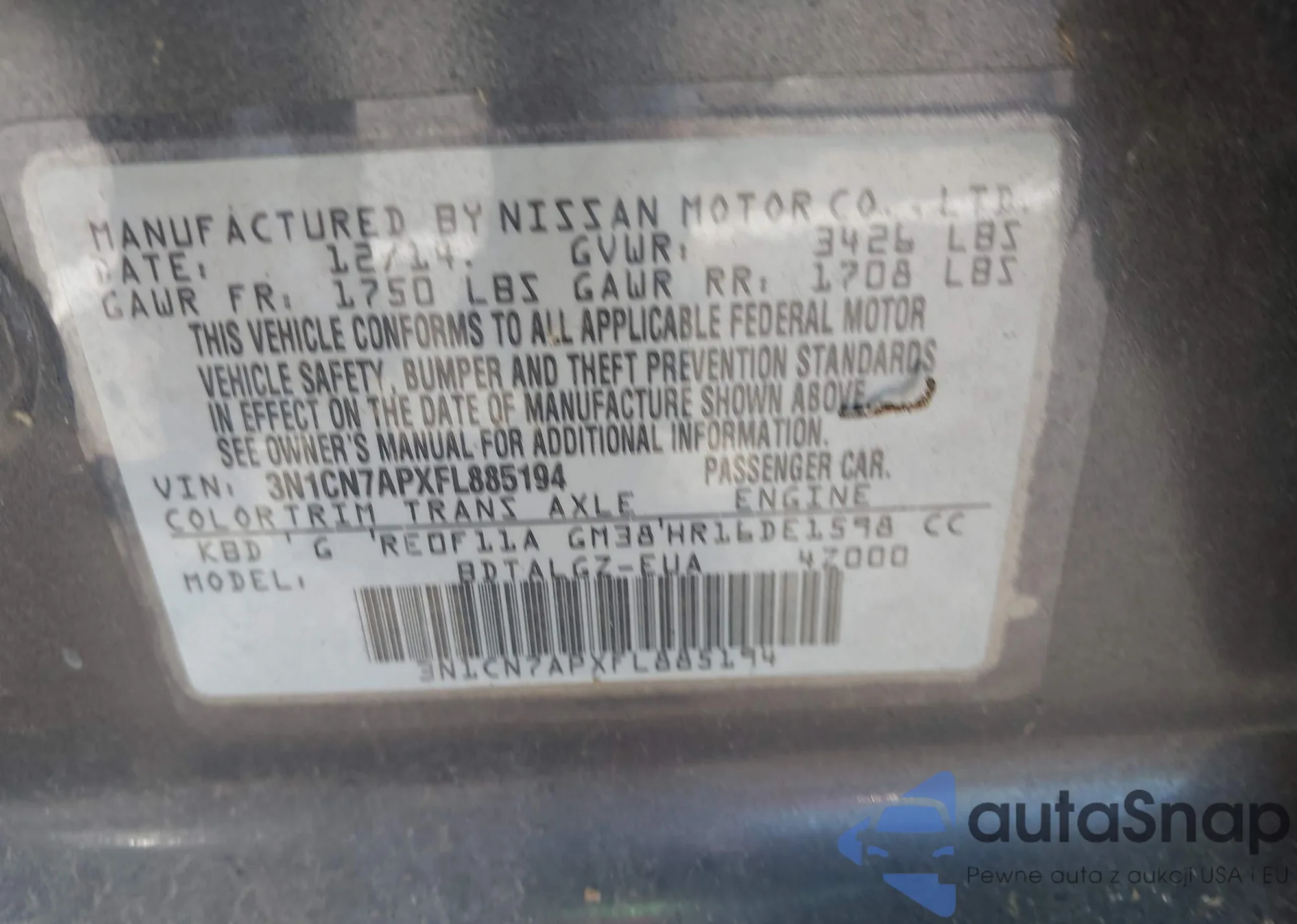 LOT: 43607309 VIN: 3N1CN7APXFL885194