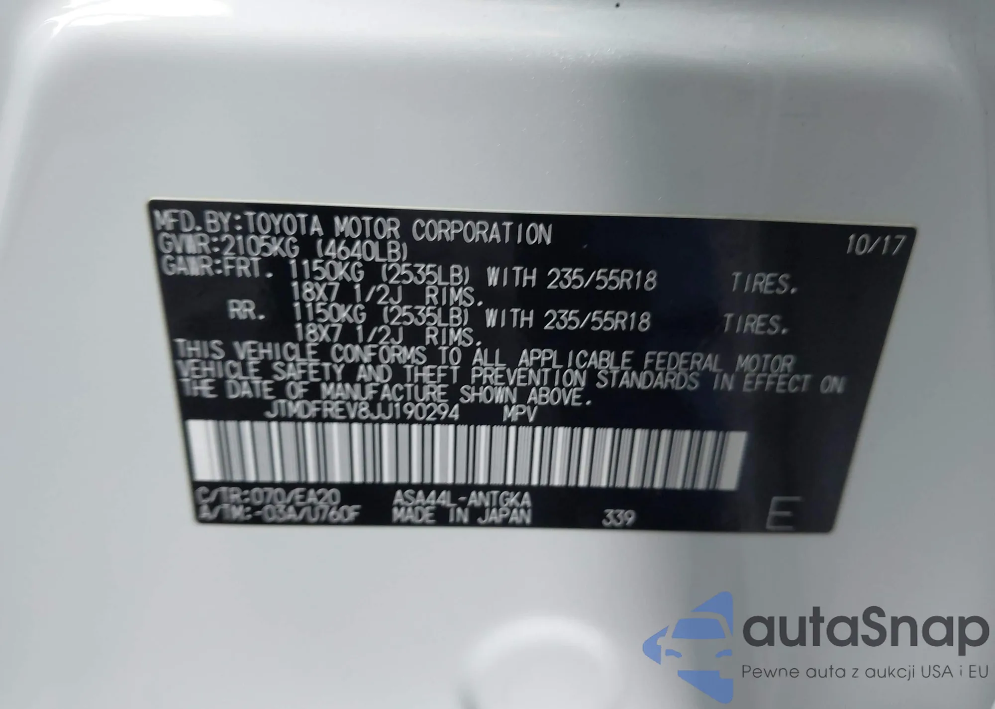 LOT: 42294905 VIN: ZASFAKAN6J7B69811