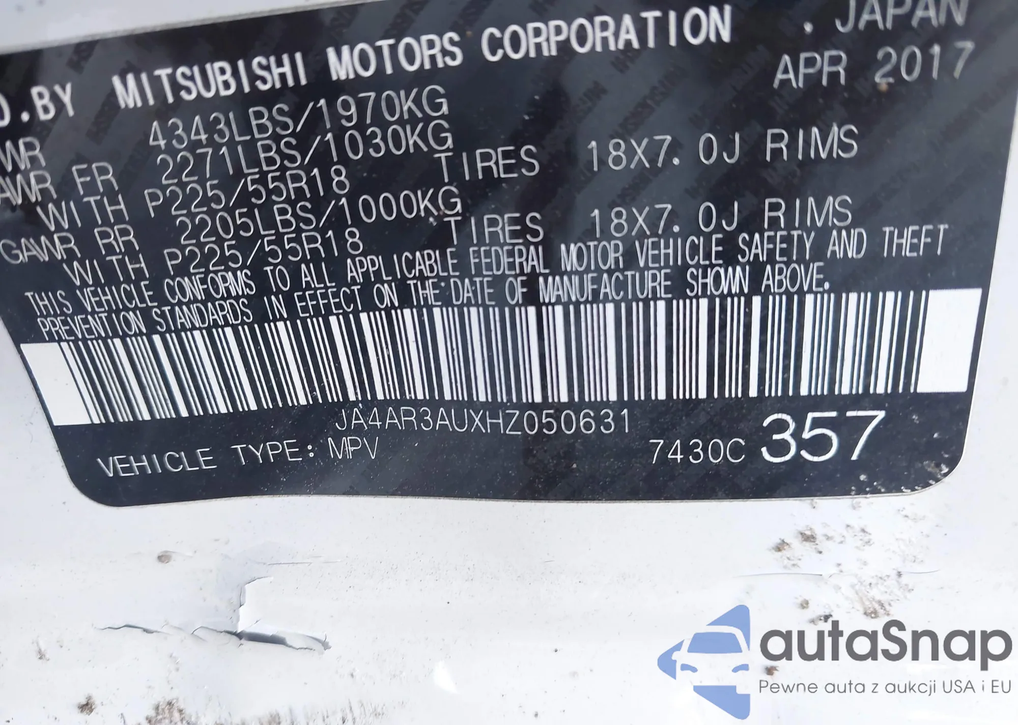 • VIN JA4AR3AUXHZ050631