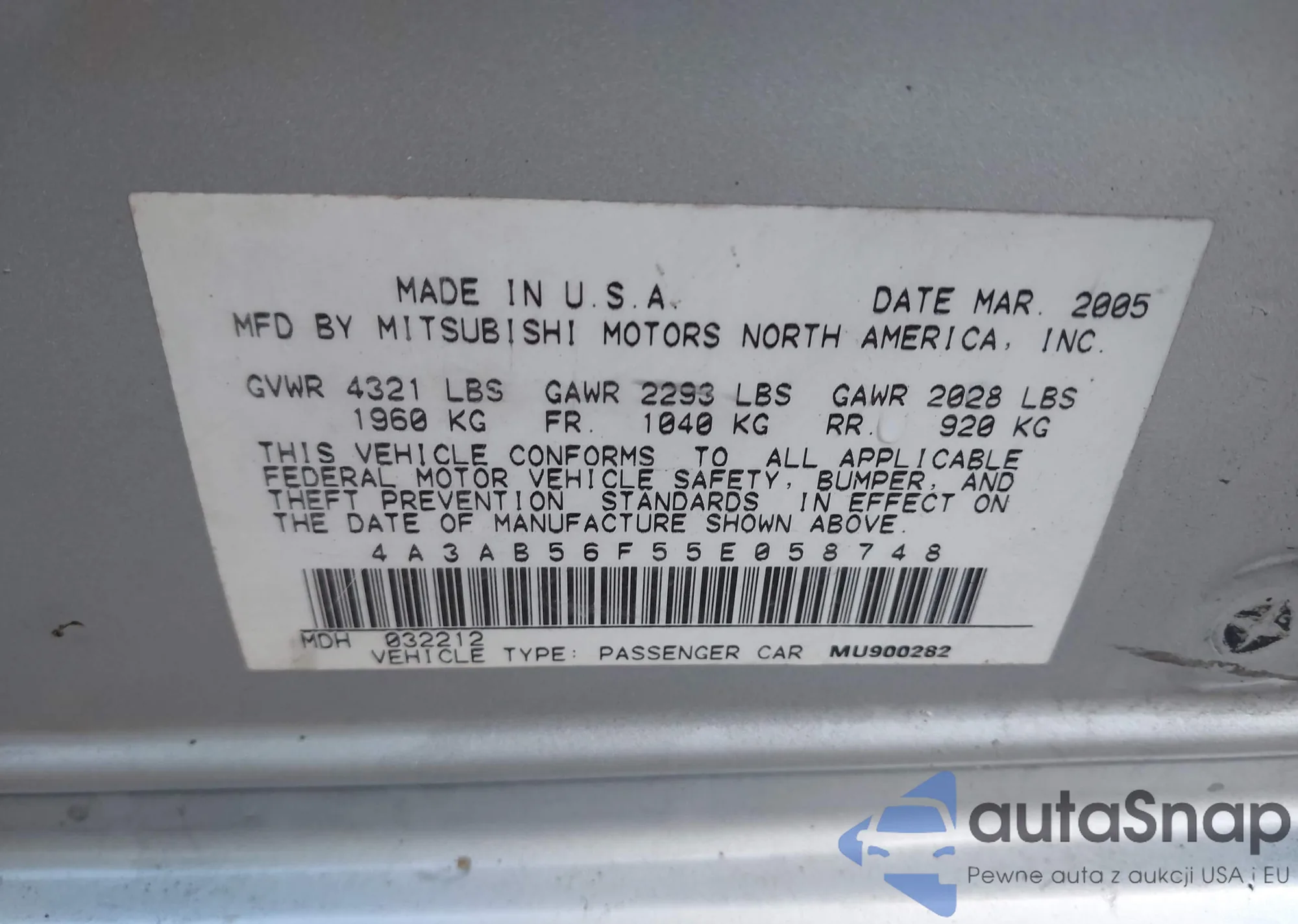 LOT: 43745432 VIN: 4A3AB56F55E058748