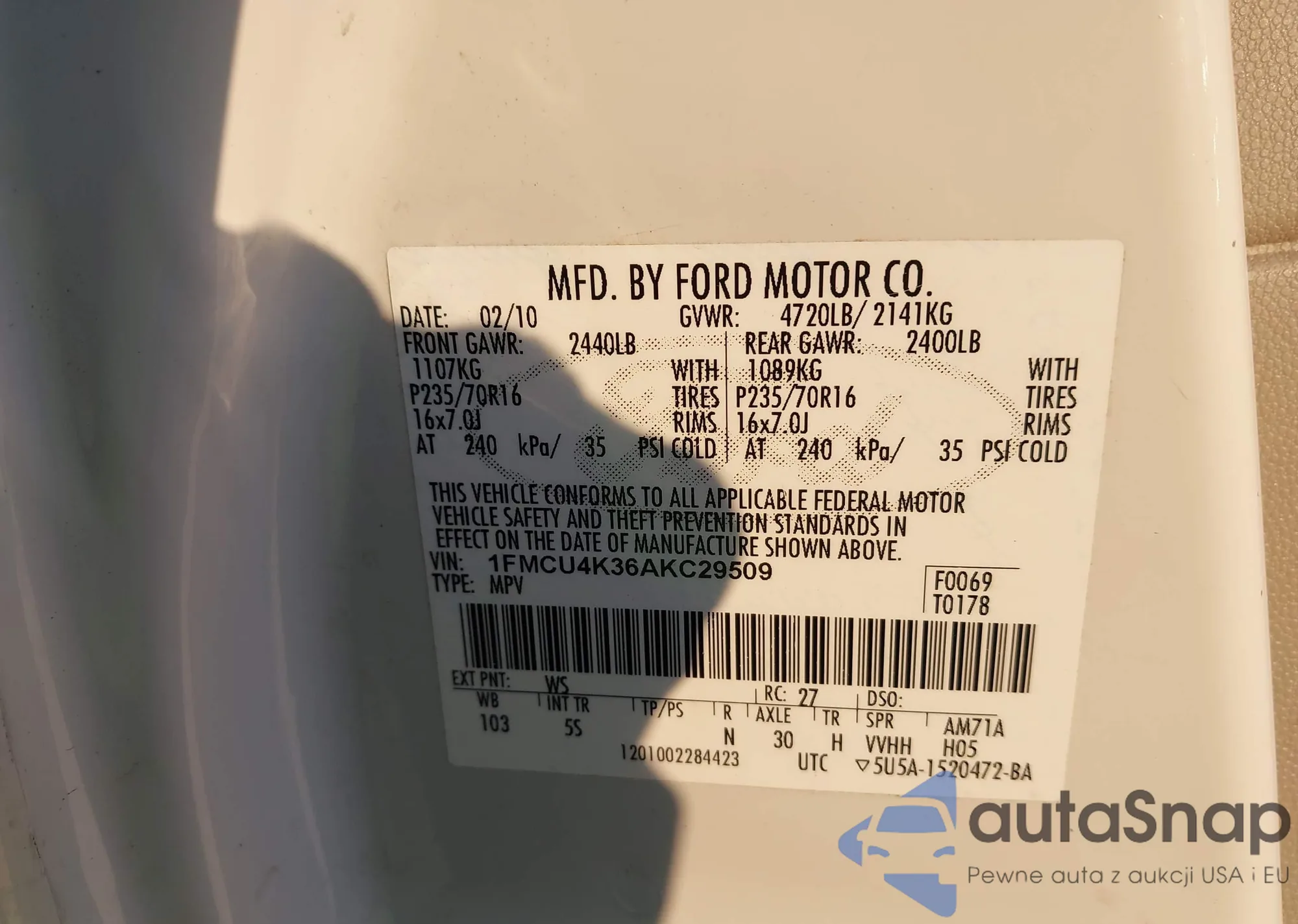 • VIN 1FMCU4K36AKC29509