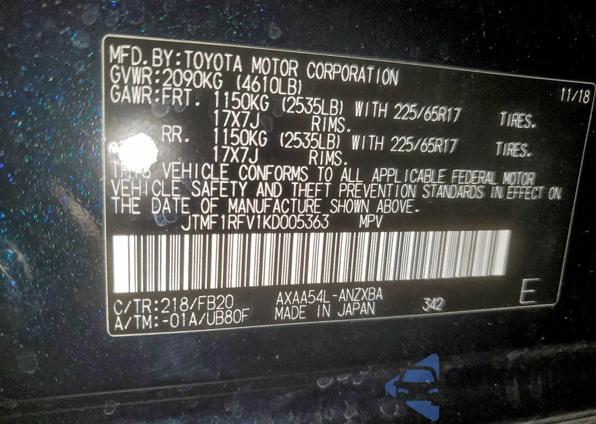 • VIN 1C4RDJAG0JC176625