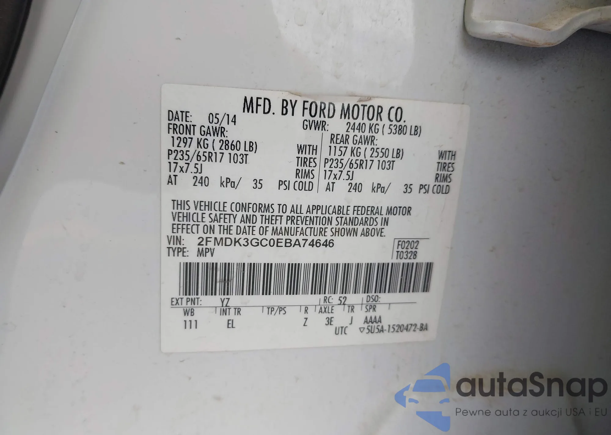 LOT: 43796751 VIN: 2FMDK3GC0EBA74646