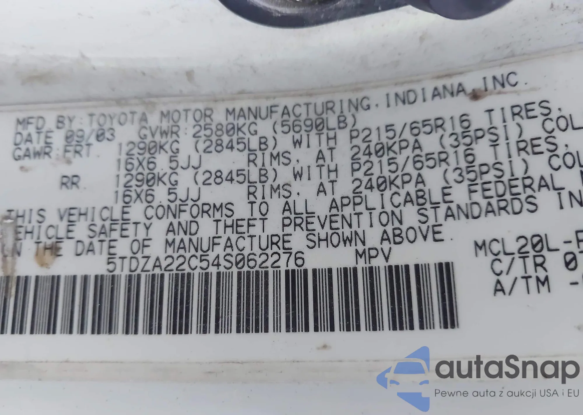 LOT: 43827127 VIN: 5TDZA22C54S062276
