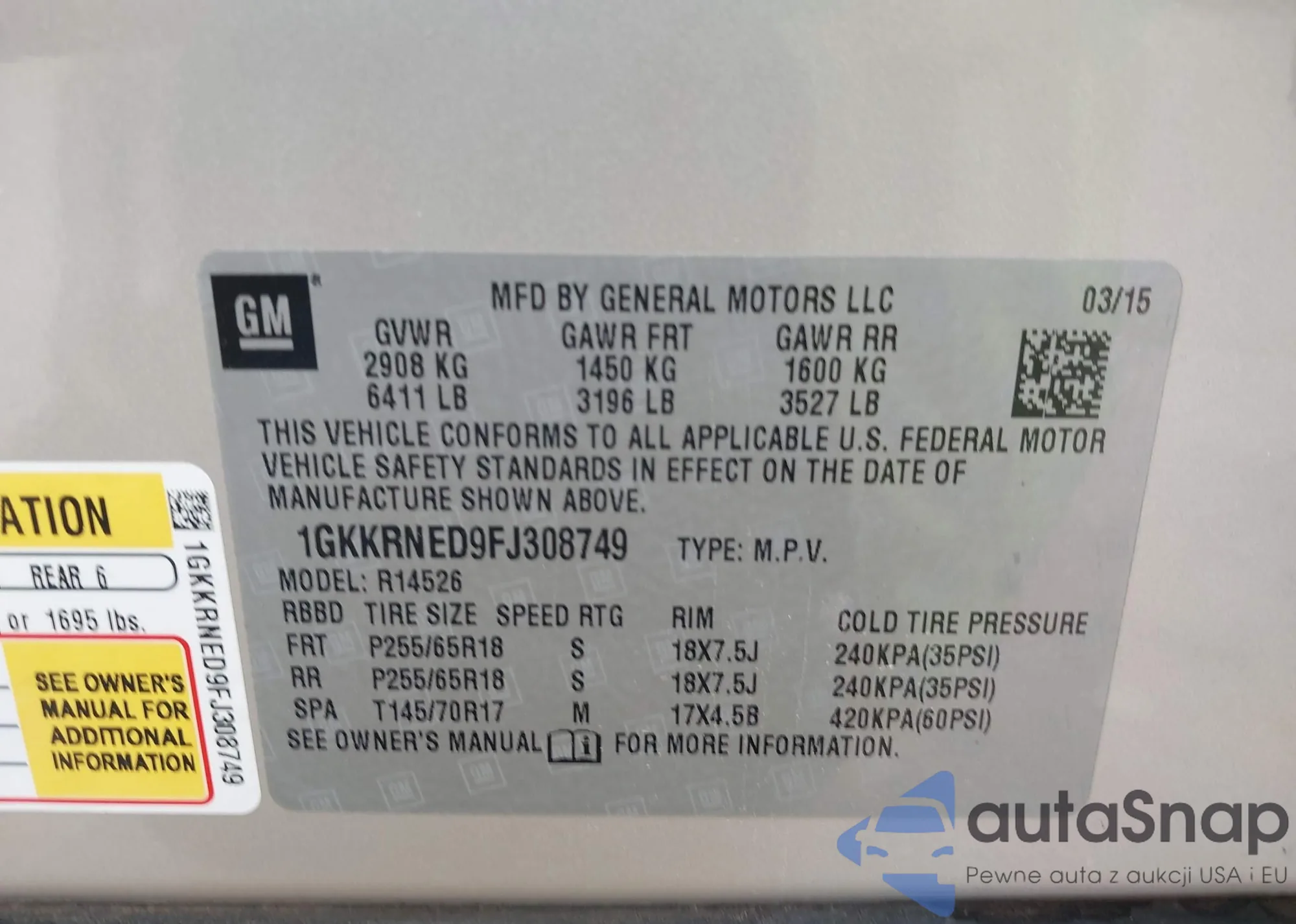LOT: 43784811 VIN: 1GKKRNED9FJ308749