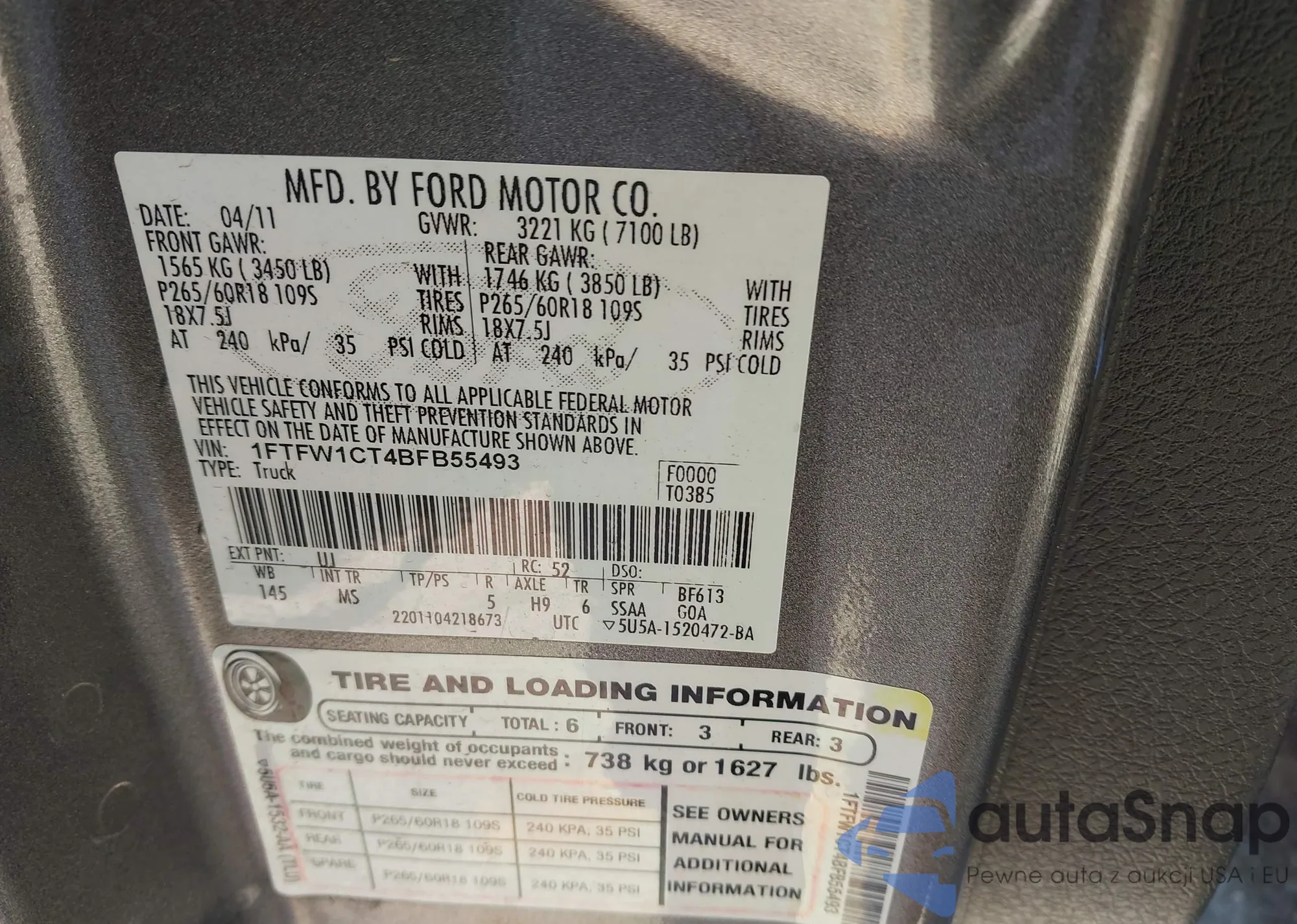 • VIN 1FTFW1CT4BFB55493