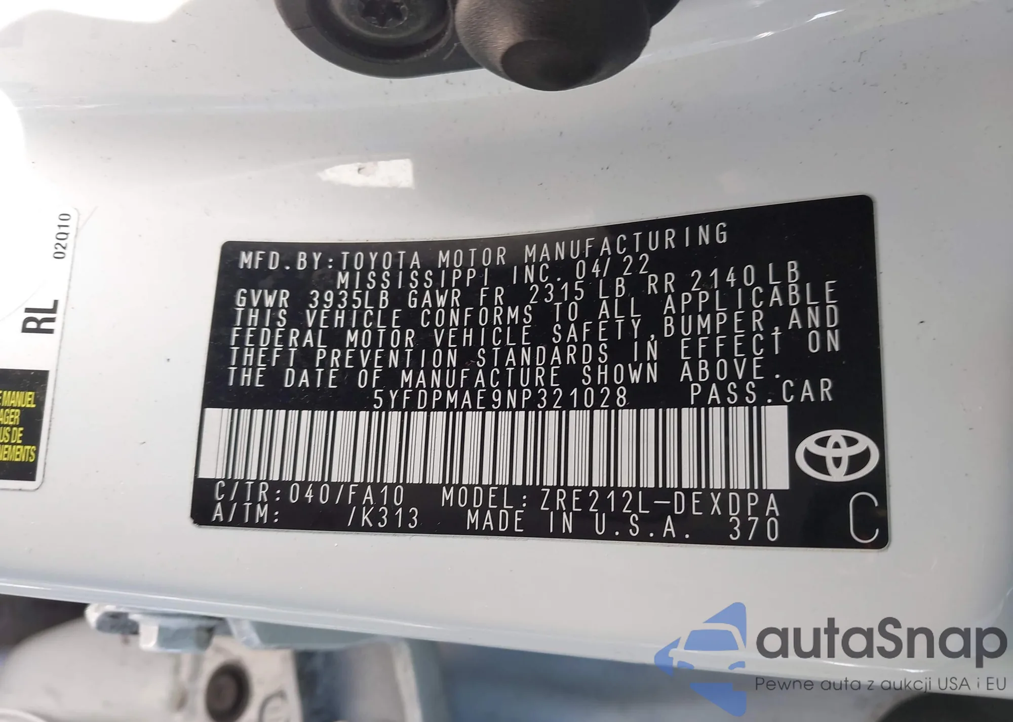 LOT: 43910160 VIN: 5YFDPMAE9NP321028